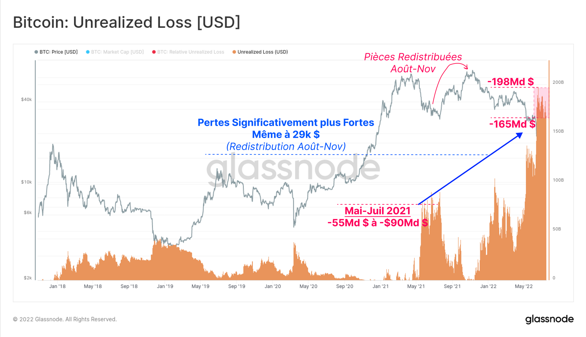 Ainsi, nous pouvons commencer par isoler uniquement les pièces qui détiennent une perte non réalisée (acheteurs du cycle 2021-22), pour calculer leur valeur globale en USD. Le marché se négociant entre 17,6k $ et 21,8k $, la perte non réalisée globale a varié entre -165Md $ et -198Md $.