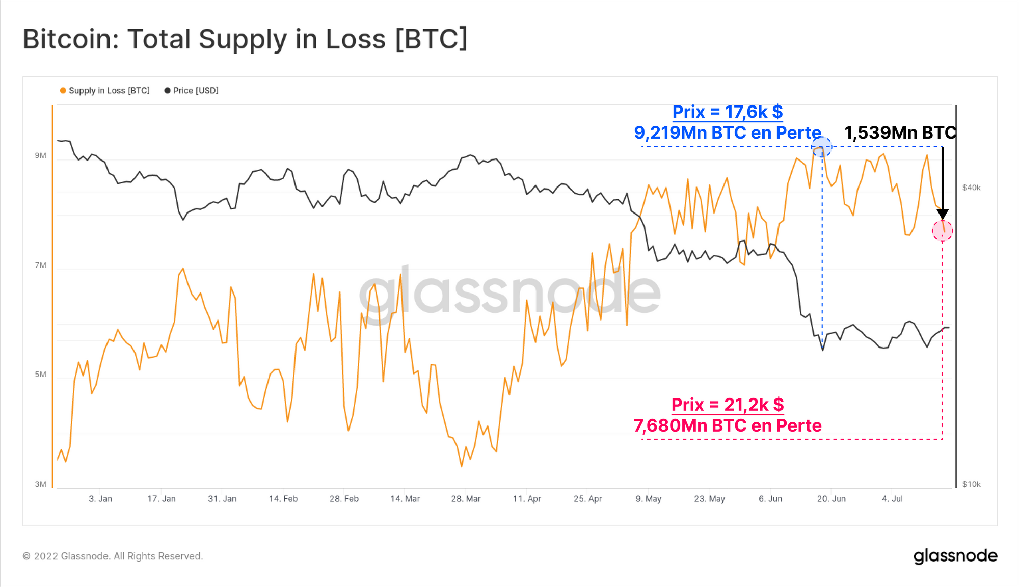 L'examen de l'offre totale de BTC en profit peut étayer cet argument. Lorsque les prix ont chuté à 17,6k$, un volume total de 9,216M BTC détenait une perte non réalisée. Cependant, après la capitulation du 18 juin, un mois de consolidation, et une hausse des prix vers 21,2k$, ce volume a diminué à 7,680M BTC.
