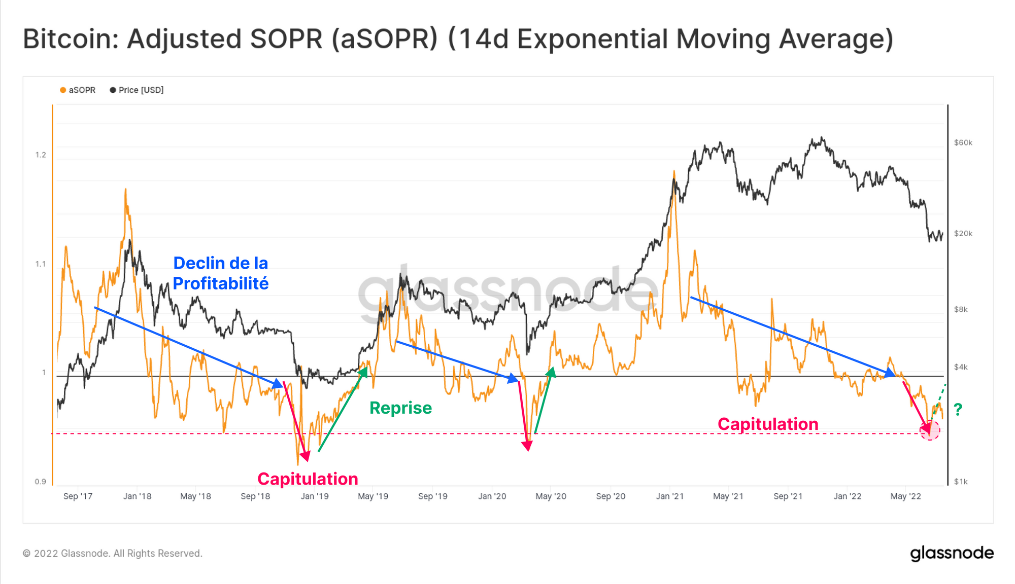 La structure de la métrique aSOPR présente également de nombreuses similitudes avec les événements de capitulation des marchés baissiers. Au fur et à mesure que la rentabilité diminue (bleu), les investisseurs commencent à réaliser des pertes de plus en plus importantes, jusqu'à ce qu'un moment final de capitulation en cascade (rouge) ait lieu. Le marché finit par atteindre l'épuisement des vendeurs, les prix commencent à se redresser et la douleur des investisseurs s'apaise (🟢).