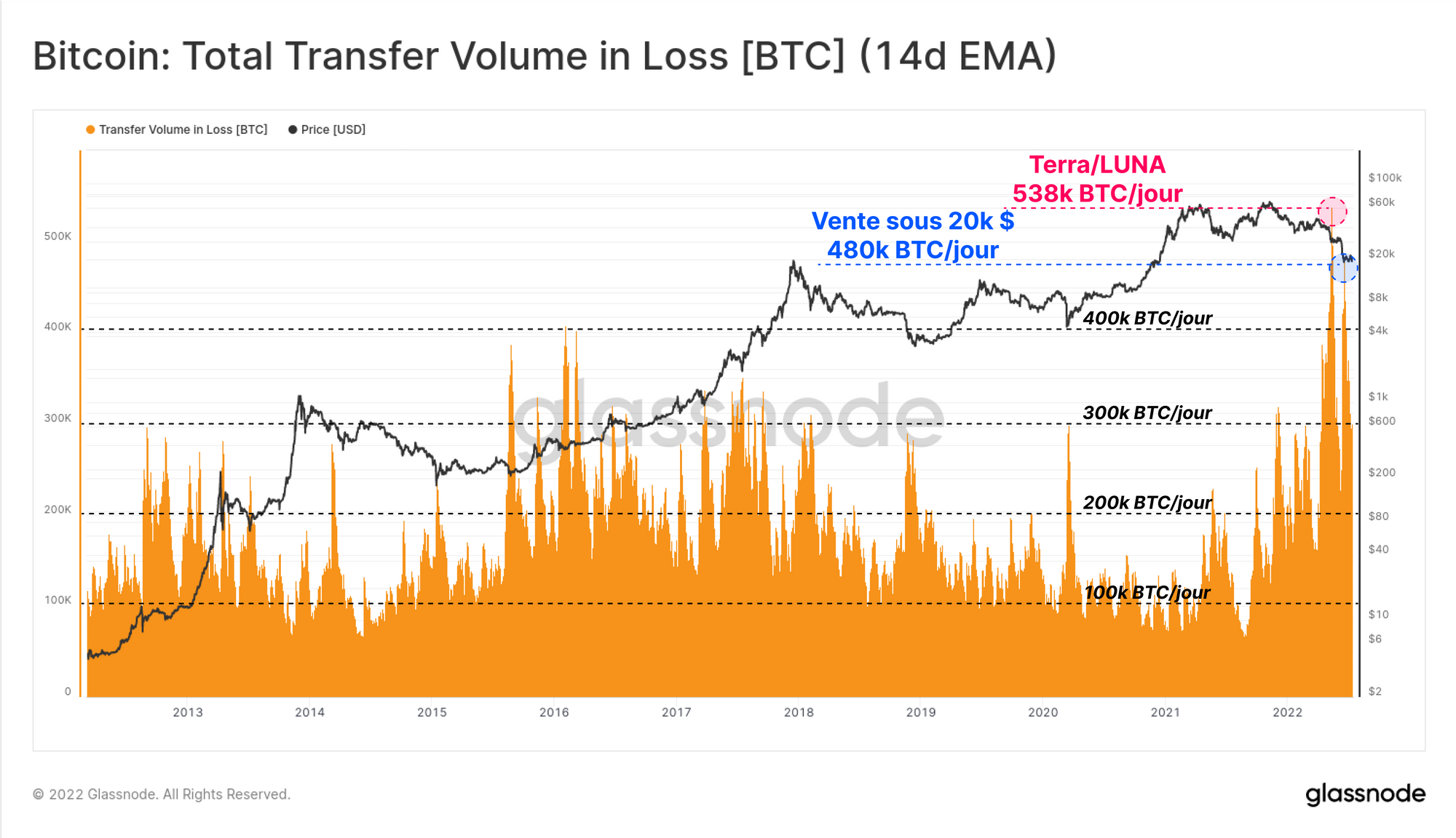 On peut en dire autant des pertes libellées en BTC, qui sont si importantes qu'il faut remonter à 2011, lorsque le BTC s'échangeait sous les 3 $, pour trouver un équivalent. Un volume tout simplement stupéfiant de BTC a déclenché une perte réalisée entre mai et juillet, avec 538k BTC dépensés pendant l'effondrement de LUNA, et 480k BTC supplémentaires dépensés le 18 juin.