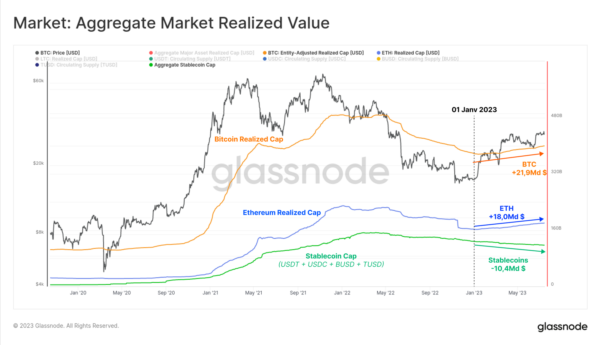 La capitalisation réalisée se situe actuellement à un peu moins de 400 milliards de dollars et indique qu'un flux régulier de capitaux entre dans l'actif depuis 2023.