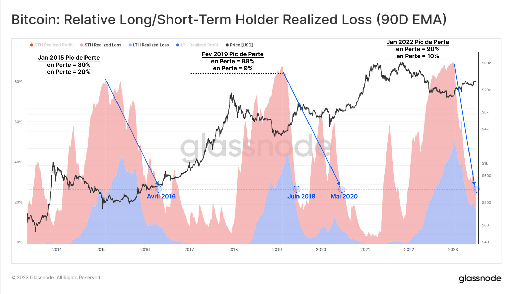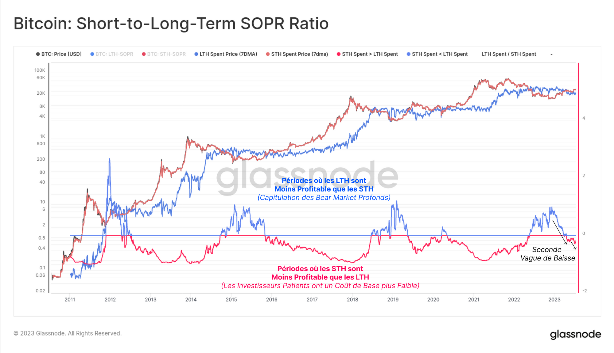 Il est rare que la cohorte des LTH dépense des BTC dont le coût de base moyen est plus élevé que la cohorte des STH. Cependant, de tels événements se produisent et sont historiquement associés à des capitulations profondes du marché baissier.