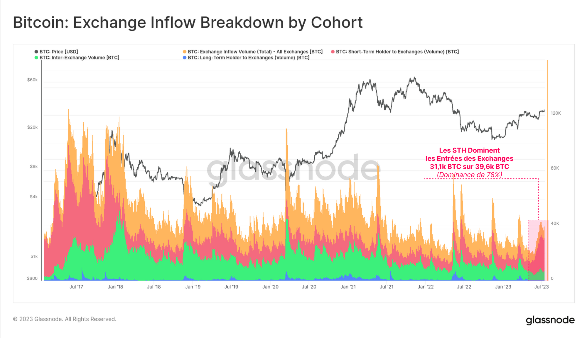 Dans cette optique, la répartition des volumes des flux entrants vers les exhanges suggère que les détenteurs à court terme (STH) sont les principales entités actives sur le marché.