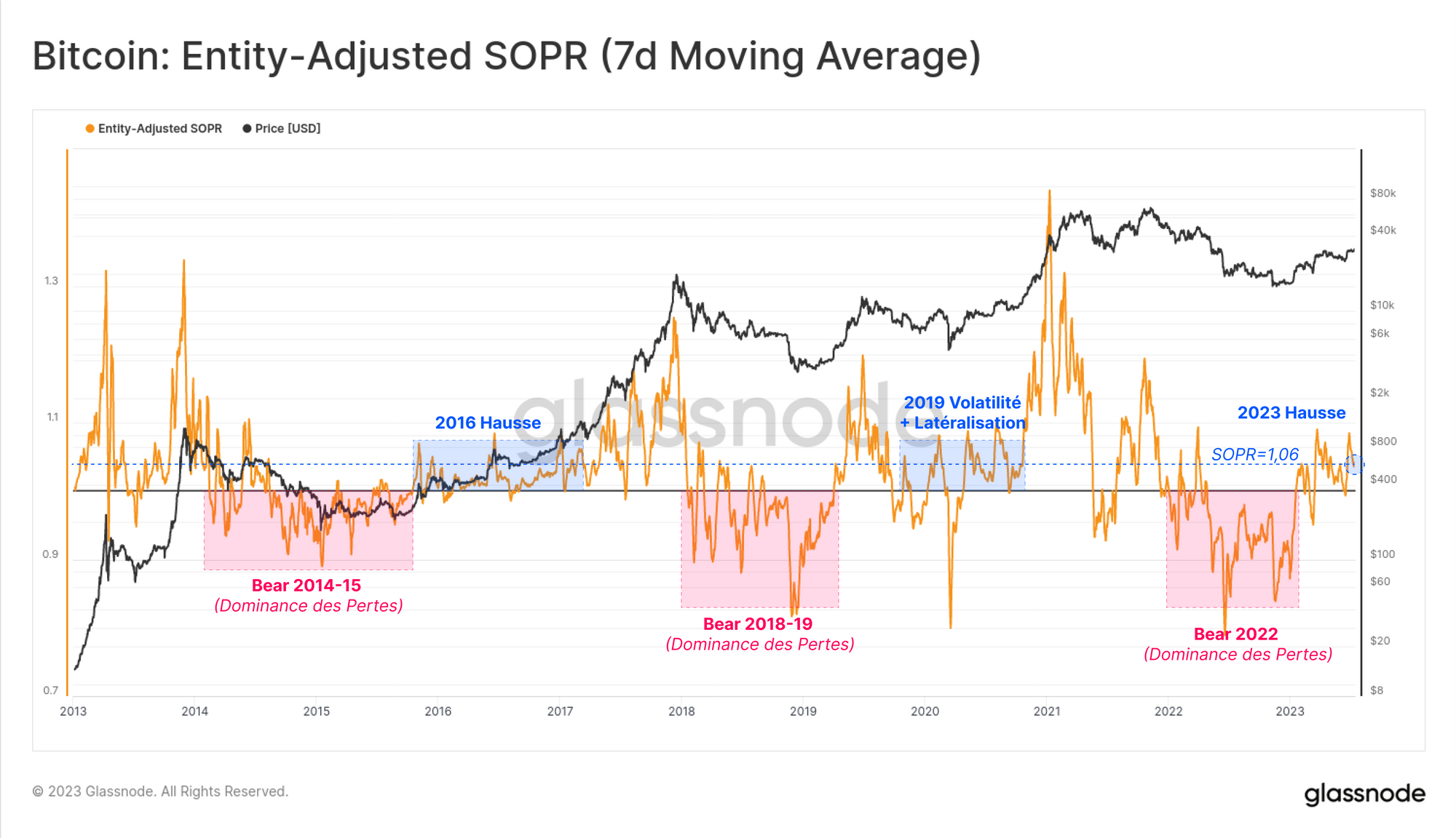 Le SOPR se trouve actuellement dans un régime de prise de bénéfices, enregistrant une valeur de 1,06, ce qui indique que le BTC moyen qui change de main réaliser un bénéfice de 6 %. Cette situation présente à nouveau des caractéristiques similaires à celles des périodes 2016 et 2019.