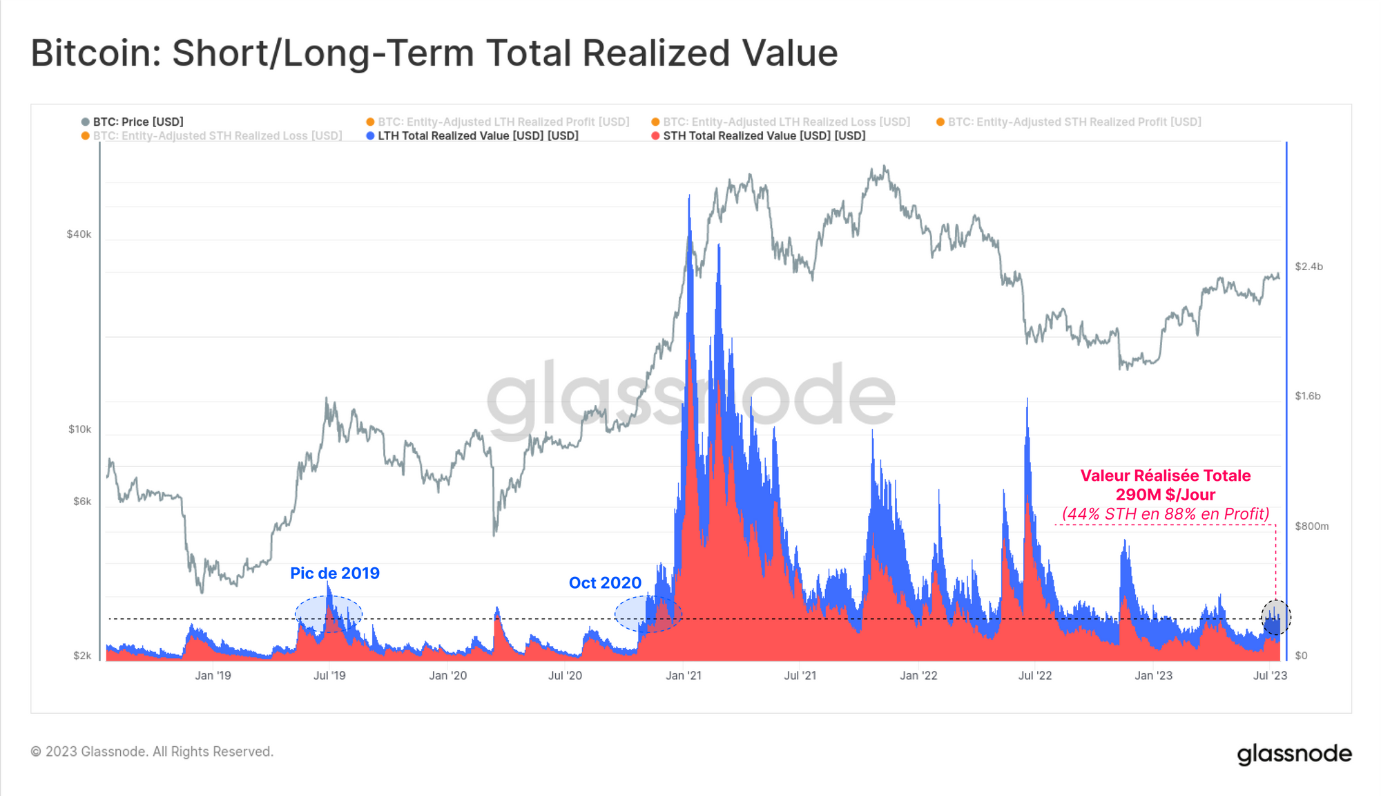 Si nous décomposons la valeur réalisée par le marché, nous pouvons illustrer la force de la reprise de 2023 jusqu'à présent. Les LTH et les STH voient maintenant la majorité (73%) de leurs dépenses générer un profit.