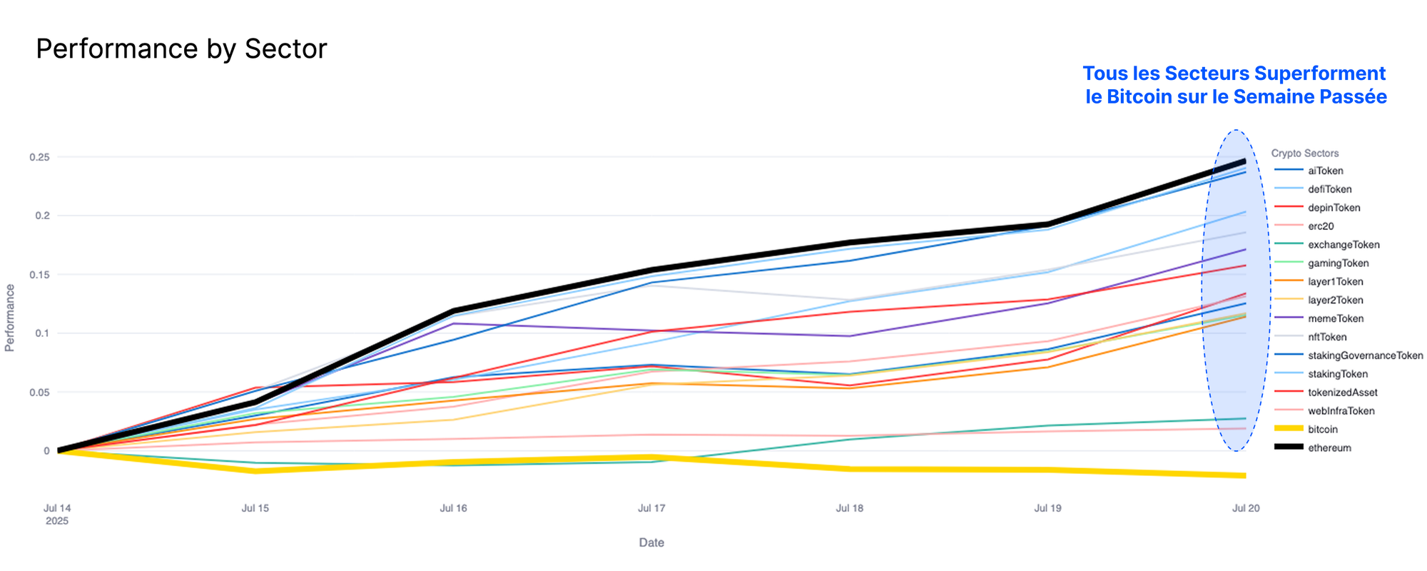En revanche, tous les autres secteurs affichent désormais des performances supérieures, notamment l'ETH. Cette mécanique est un exemple classique de rotation des capitaux le long de la courbe de risque.