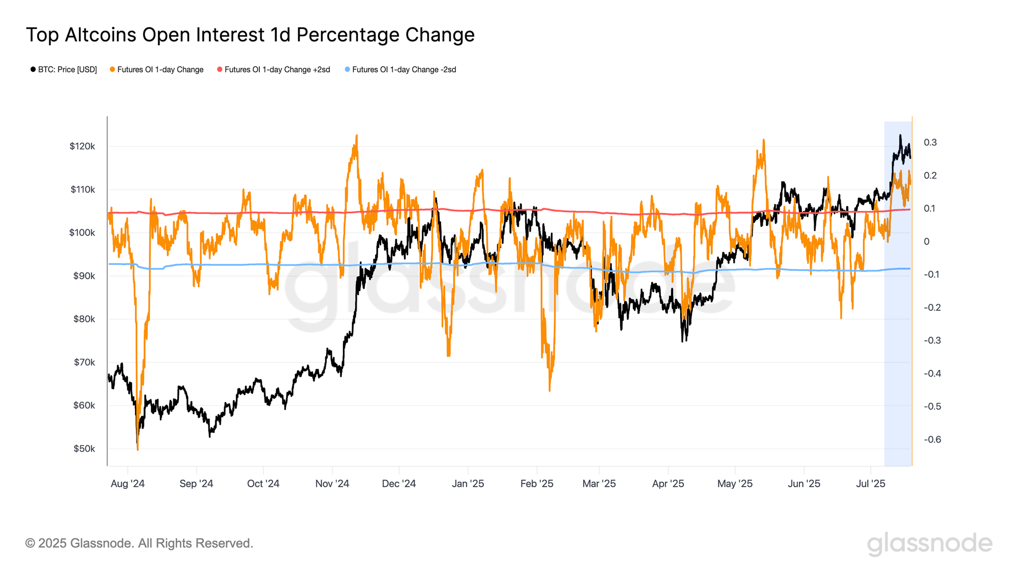 - L'intérêt ouvert sur les principaux altcoins a bondi de 26 à 44 milliards de dollars au cours du mois de juillet. Un effet de levier élevé tend à amplifier la volatilité à la hausse comme à la baisse et peut contribuer à un environnement de marché plus fragile.