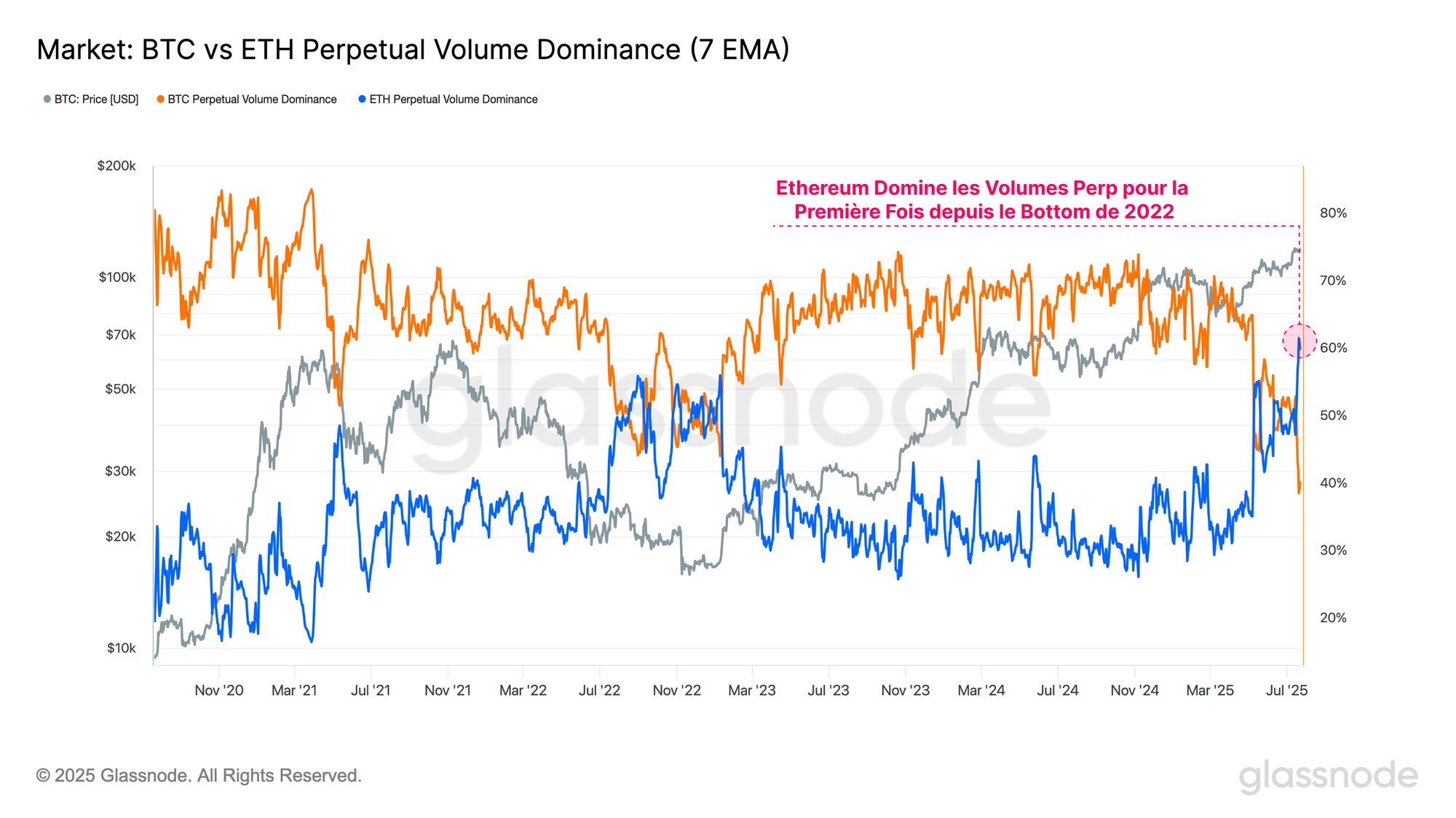 Ceci est particulièrement apparent dans le secteur des contrats perpétuels, où la domination de l'ETH a atteint un niveau record, dépassant le BTC pour la première fois depuis le point bas de 2022.