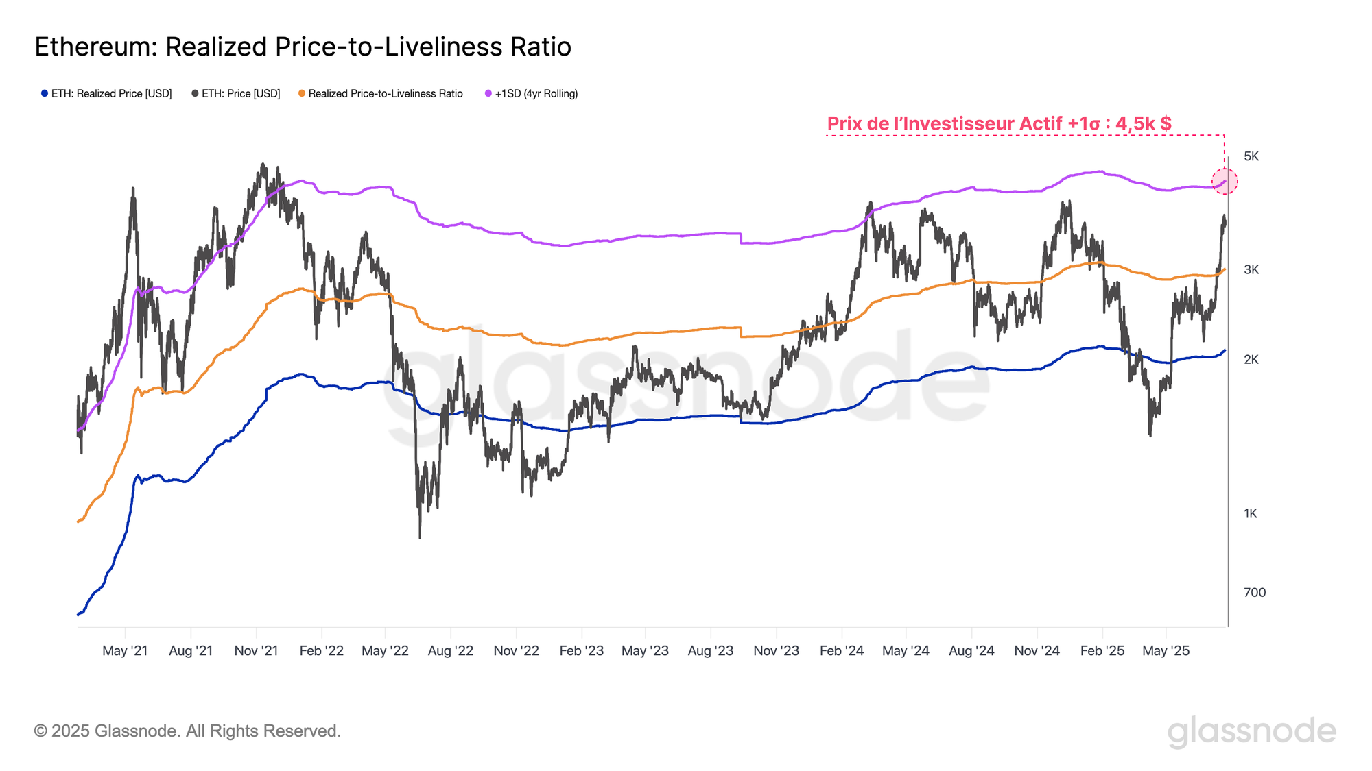 Afin d'évaluer les objectifs de hausse pour ce rallye de l'ETH, nous pouvons nous tourner vers la bande d'écart-type +1 du prix actif réalisé.