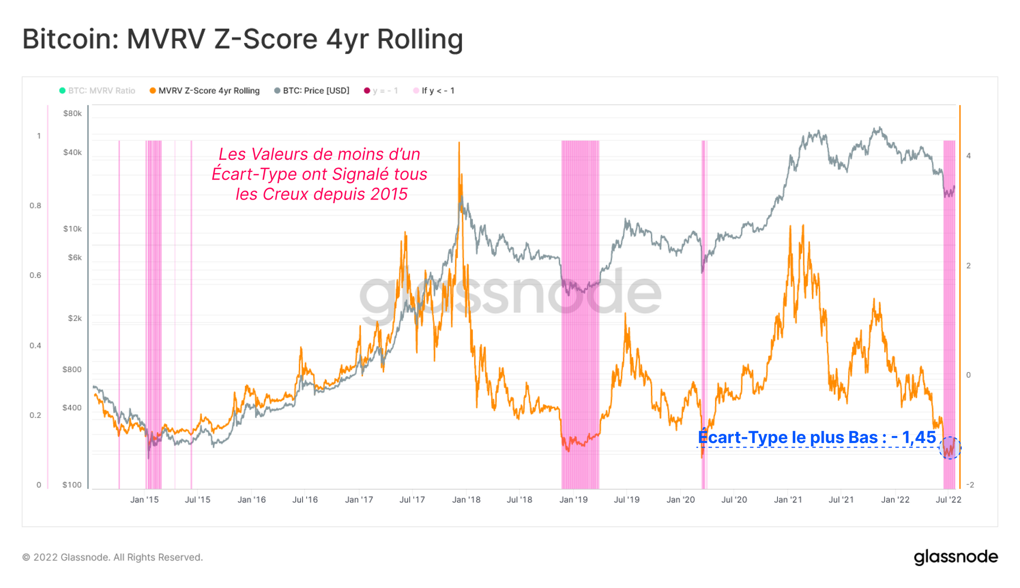 - Les écarts-types inférieurs à -1 sont historiquement utiles afin d'identifier la formation de creux de marché. Jusqu'à présent, ils ont signalé une sous-évaluation pour tous les points bas des cycles baissiers, y compris 2015, 2018 et le flash crack de mars 2020.