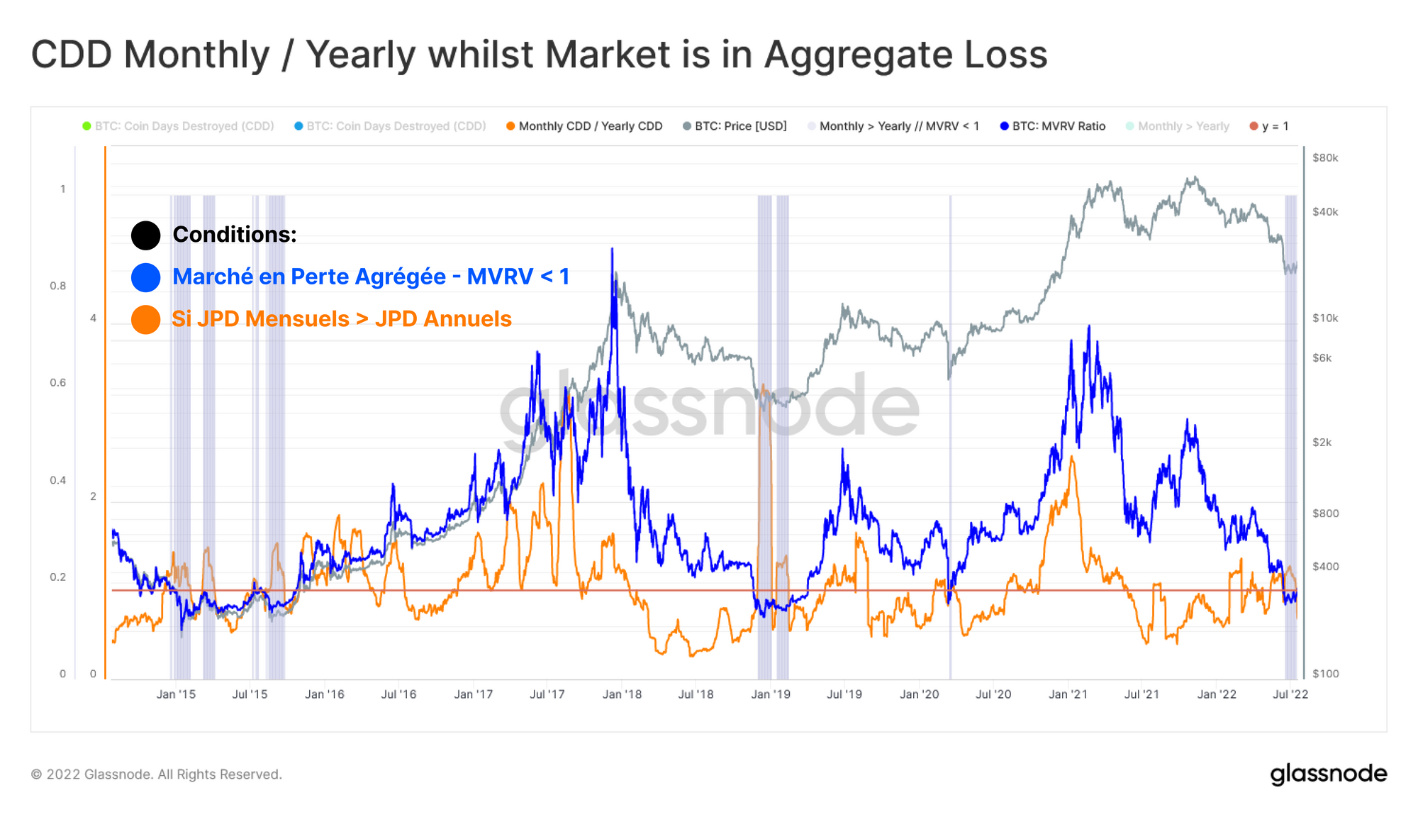 - Des valeurs élevées de l'oscillateur JPD supérieures à 1 alors que le marché est en perte globale (MVRV inférieur à 1) coïncident généralement avec des périodes de capitulation.