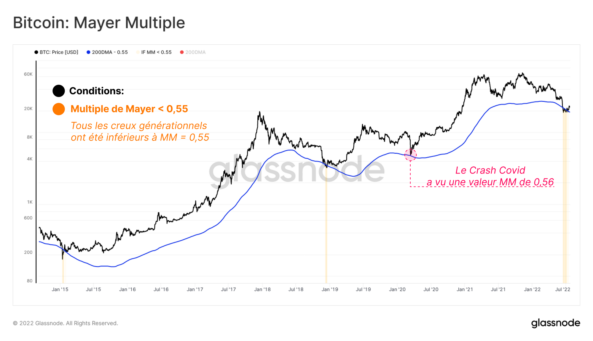 Le multiple de Mayer peut être utilisé pour évaluer les écarts entre le prix spot et la 200DMA. La 200DMA est largement utilisée dans le cadre de l'analyse technique traditionnelle comme outil de distinction entre les tendances macro haussières et baissières.