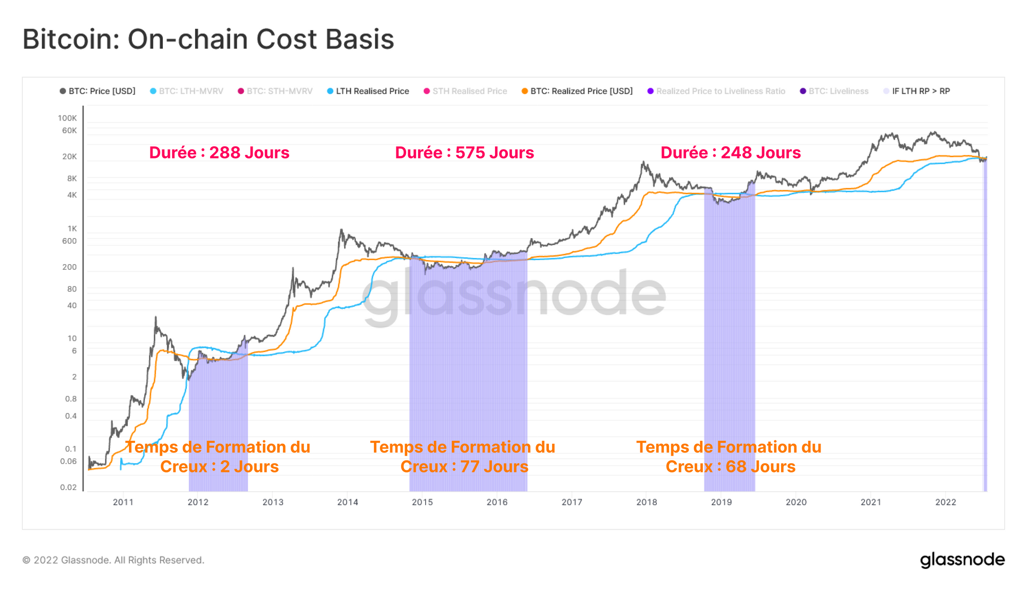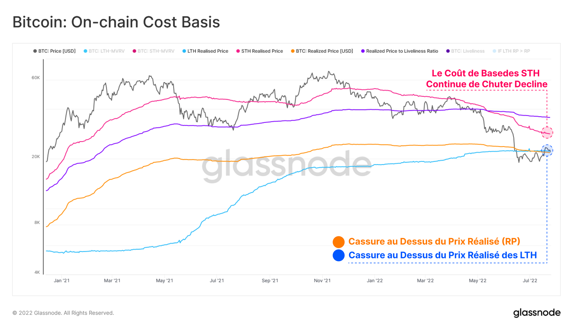 Une interaction intéressante à observer est le moment où le coût de base des LTH repasse au-dessus du prix réalisé. Pour que le PR-LTH augmente, les LTH doivent soit acheter des pièces au-dessus de leur propre base de coût, soit les pièces avec une base de coût plus élevée doivent arriver à maturité après le seuil de 155 jours.