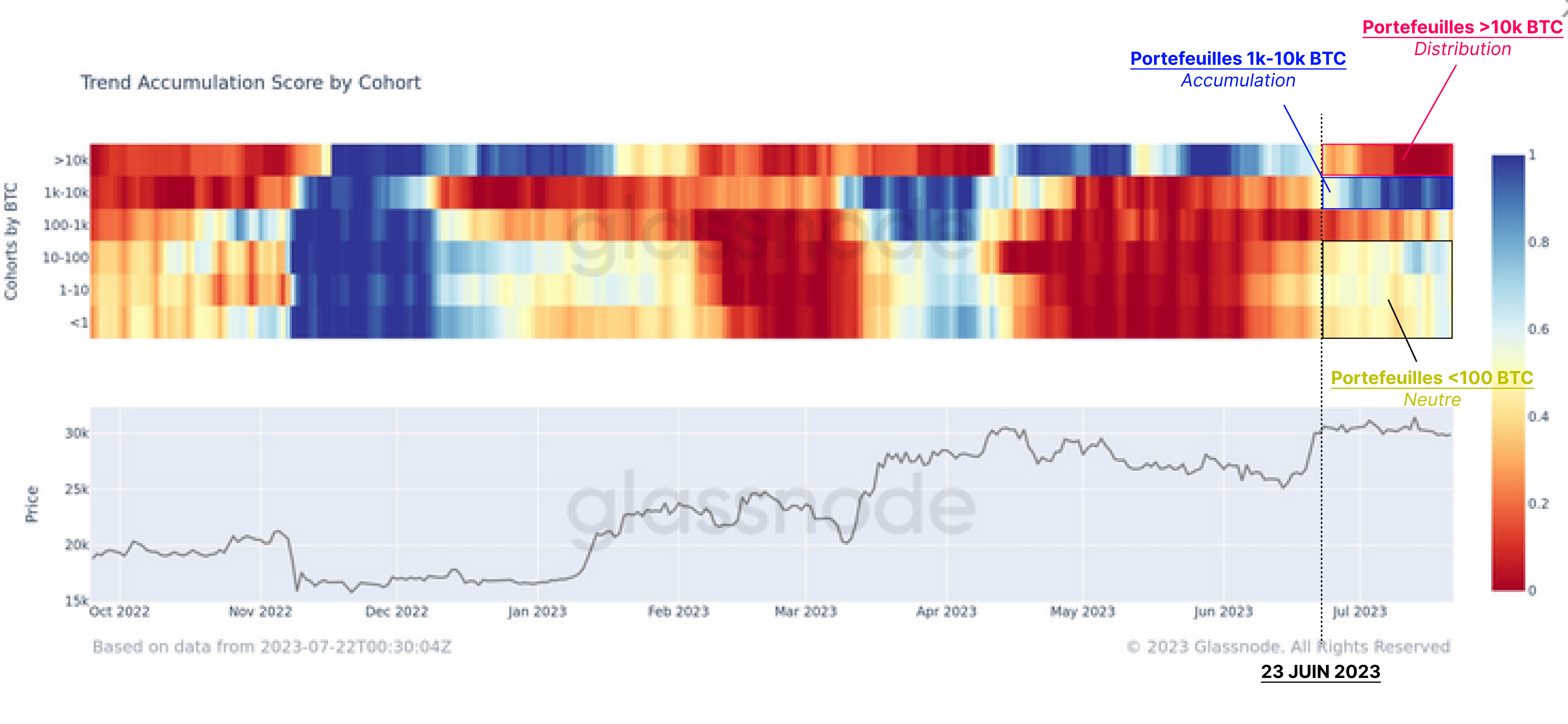 De ce point de vue, nous pouvons à nouveau constater que le comportement des baleines (forte tendance à la distribution) est très différent de celui du reste du marché (tendance modérée à la distribution).