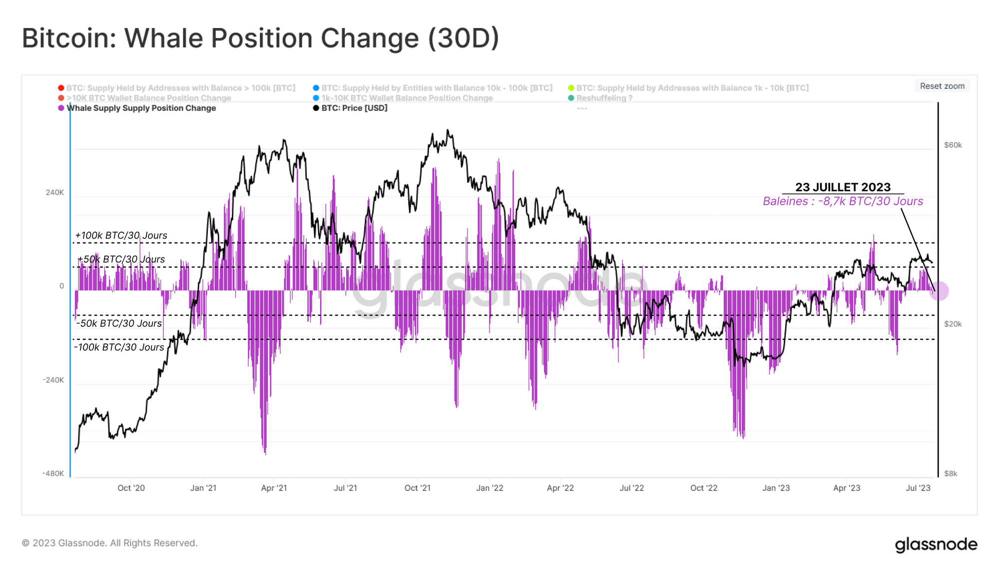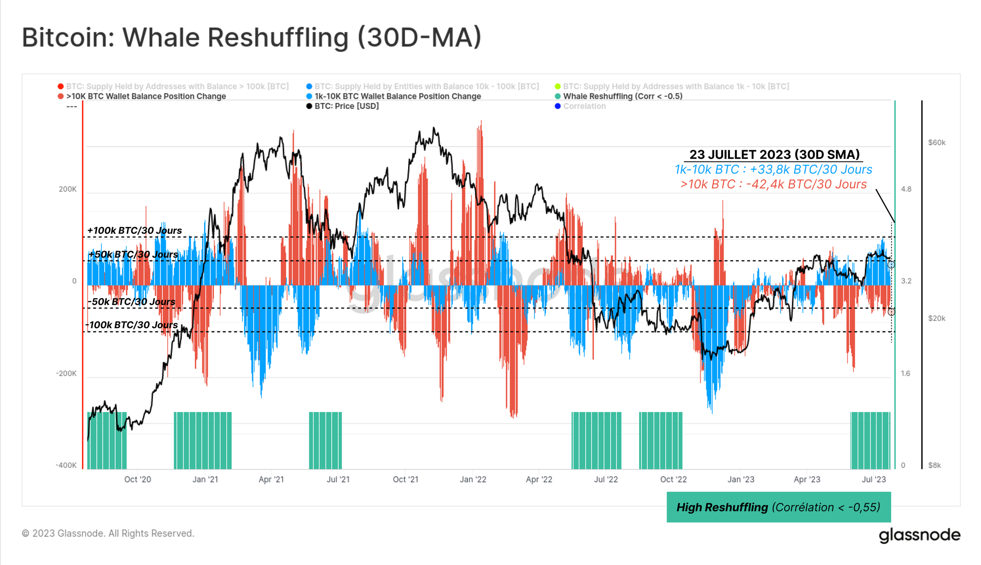 Pour tester cette hypothèse de remaniement des baleines, nous pouvons étudier le changement de position sur 30 jours pour les sous-groupes des baleines (>10K BTC 🟥 et 1k-10k BTC 🟦).