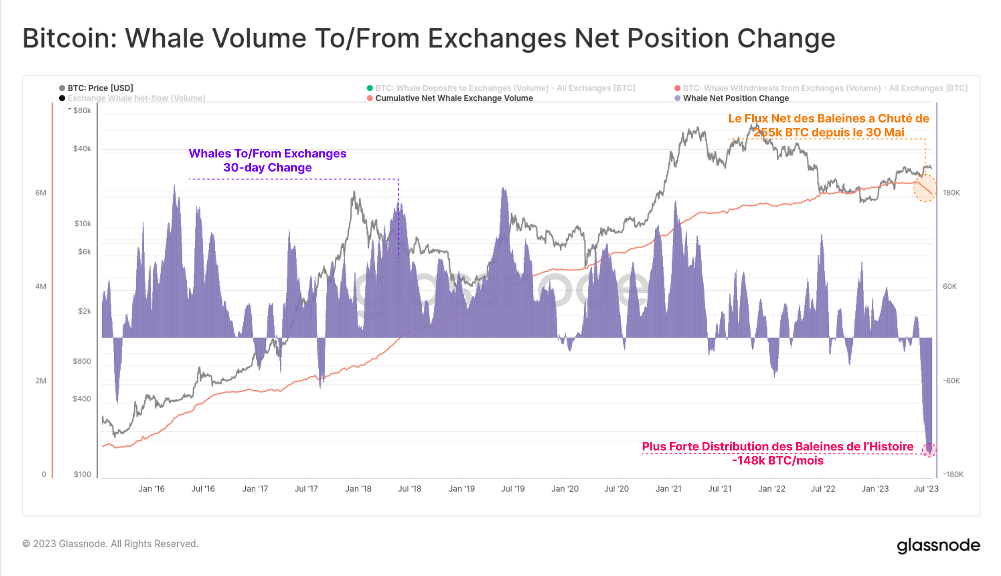 Le graphique ci-dessous montre que le solde global des baleines a diminué de 255 000 BTC depuis le 30 mai.Il s'agit de la plus forte baisse mensuelle de l'histoire, avec -148 000 BTC/mois.