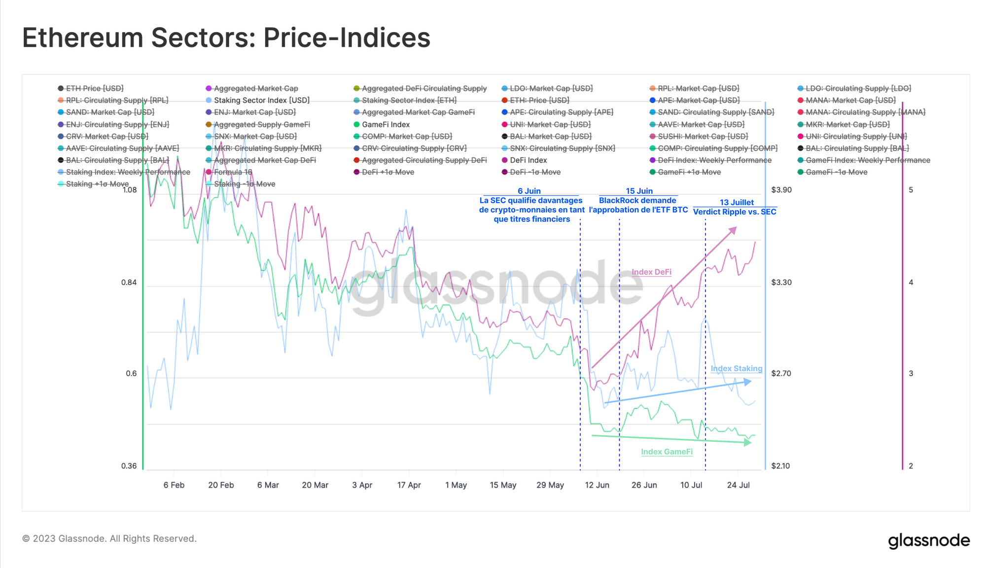 Les tokens liés au secteur DeFi ont enregistré les meilleures performances, le prix de notre indice DeFi ayant progressé de 56 % depuis le plus bas atteint le 11 juin. D'autres secteurs clés du marché, tels que la GameFi et le Staking, ont sous-performé en comparaison.
