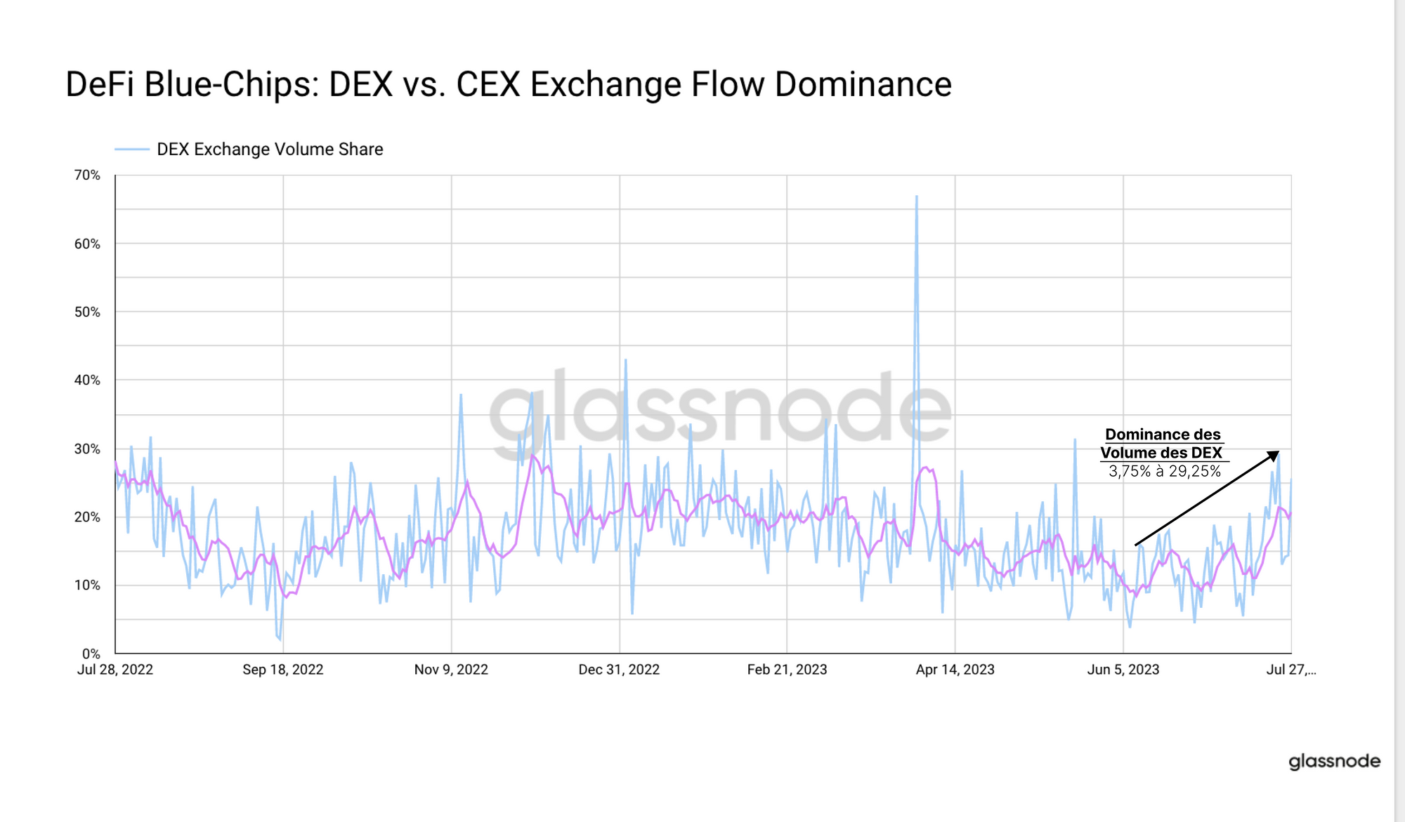 En examinant les volumes des DEX vs. CEX pour les huit premiers tokens DeFi, nous pouvons constater un regain d'intérêt pour l'activité sur les DEX. La part relative du volume échangé sur les DEX est passée de 3,75 % au début du mois de juin à 29,2 % aujourd'hui, ce qui est proche des sommets atteints au cours du second semestre 2022.