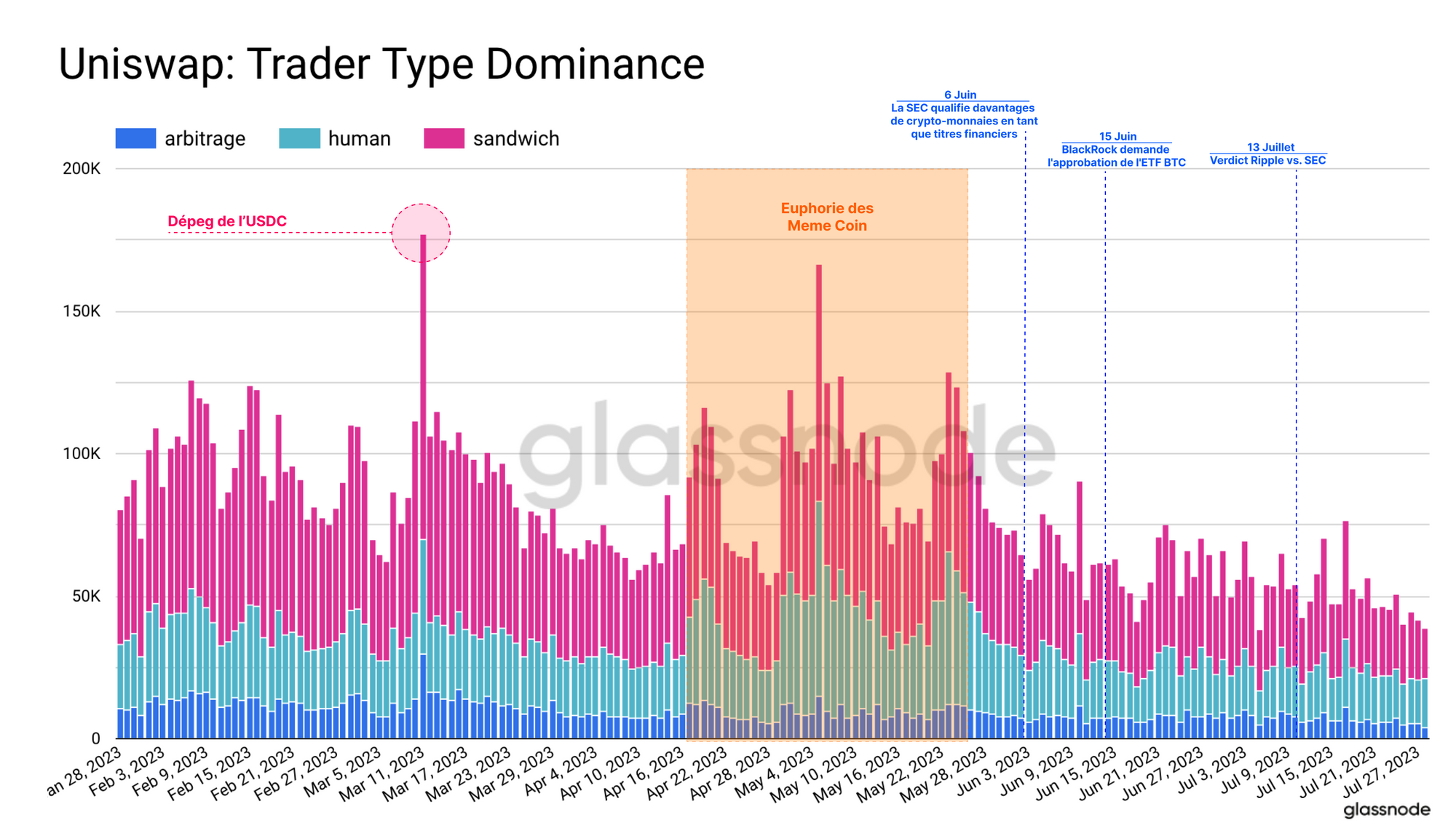 Nous pouvons constater que les traders humains ont été très actifs lors d'événements majeurs tels que le depeg de l'USDC ou la hype des meme-coins.
