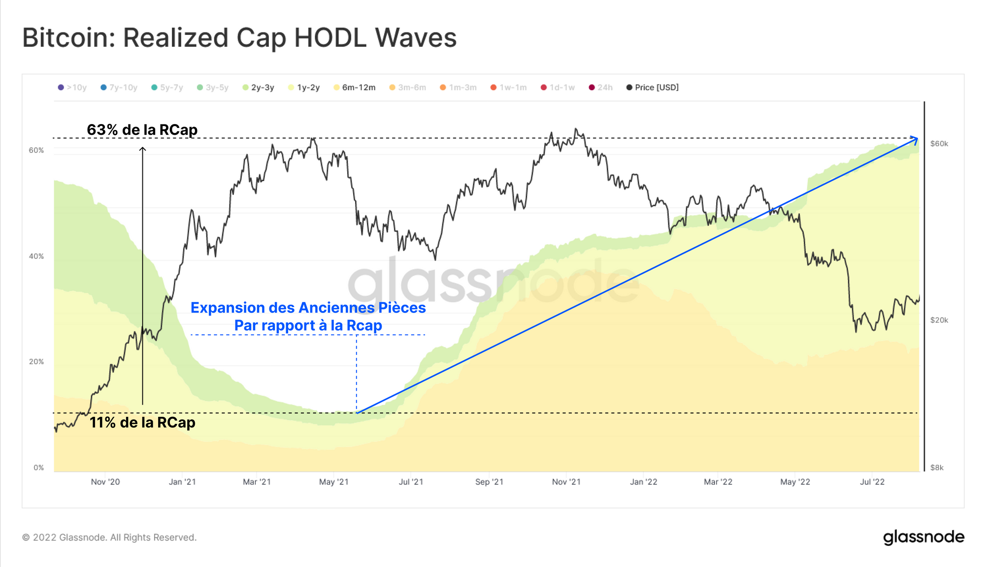 Diviser ces volumes de BTC par la Capitalisation Réalisée (RCap) permet ensuite d'évaluer la valeur en USD détenue dans ces mêmes tranches d'âge. Ici, nous pouvons voir un résultat encore plus intriguant, où la valeur globale en USD détenue dans ces cohortes a bondi de 52%, représentant maintenant 63% la Capitalisation Réalisée.