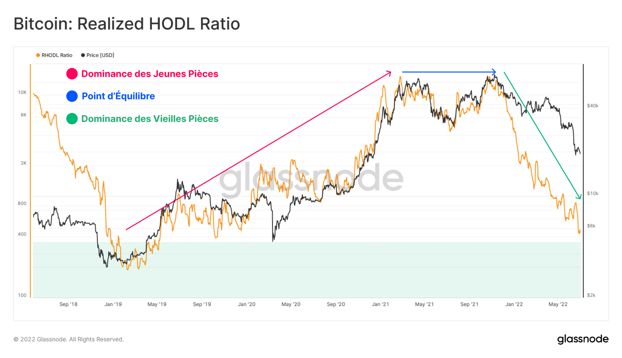 La valeur libellée en USD de la cohorte des jeunes pièces a connu une baisse structurelle après le sommet de mars 2021. Cela résulte à la fois du comportement d'accumulation (laisser les pièces arriver à maturité), mais aussi de la réévaluation des pièces à des prix de plus en plus bas pendant la période baissière.