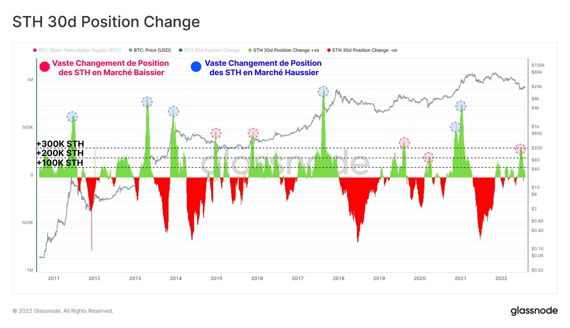 Par définition, ces pièces ont été transférées dans la cohorte des détenteurs à court terme via les exchanges. Depuis l'effondrement de LUNA le 08 mars 2020, l'offre de STH a augmenté de +330k BTC.