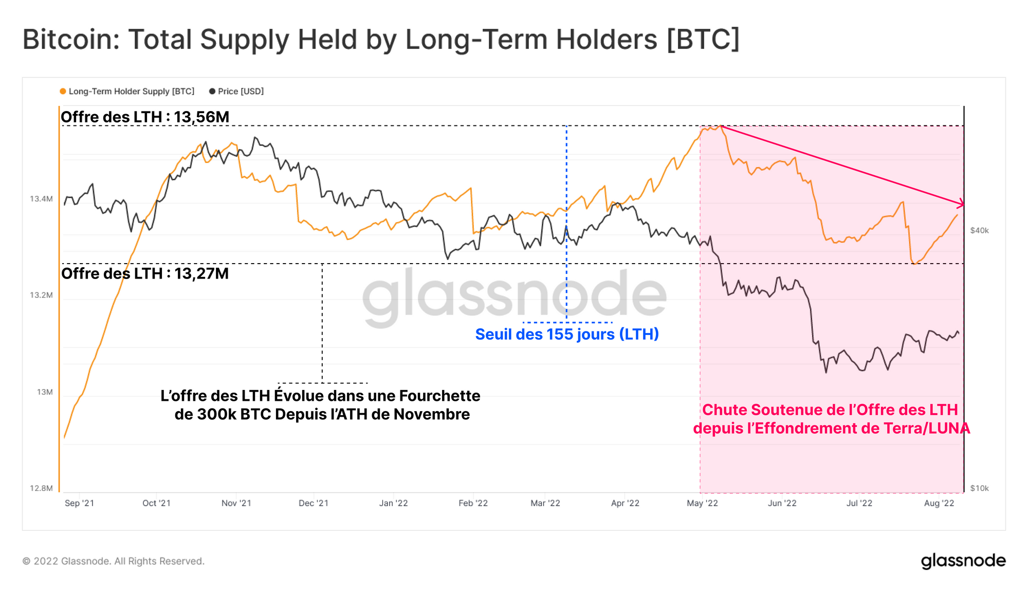 - L'offre des LTH est comprise entre 13,56M et 13,27M BTC depuis l'ATH de novembre 2021, déclinant de seulement 300K BTC.