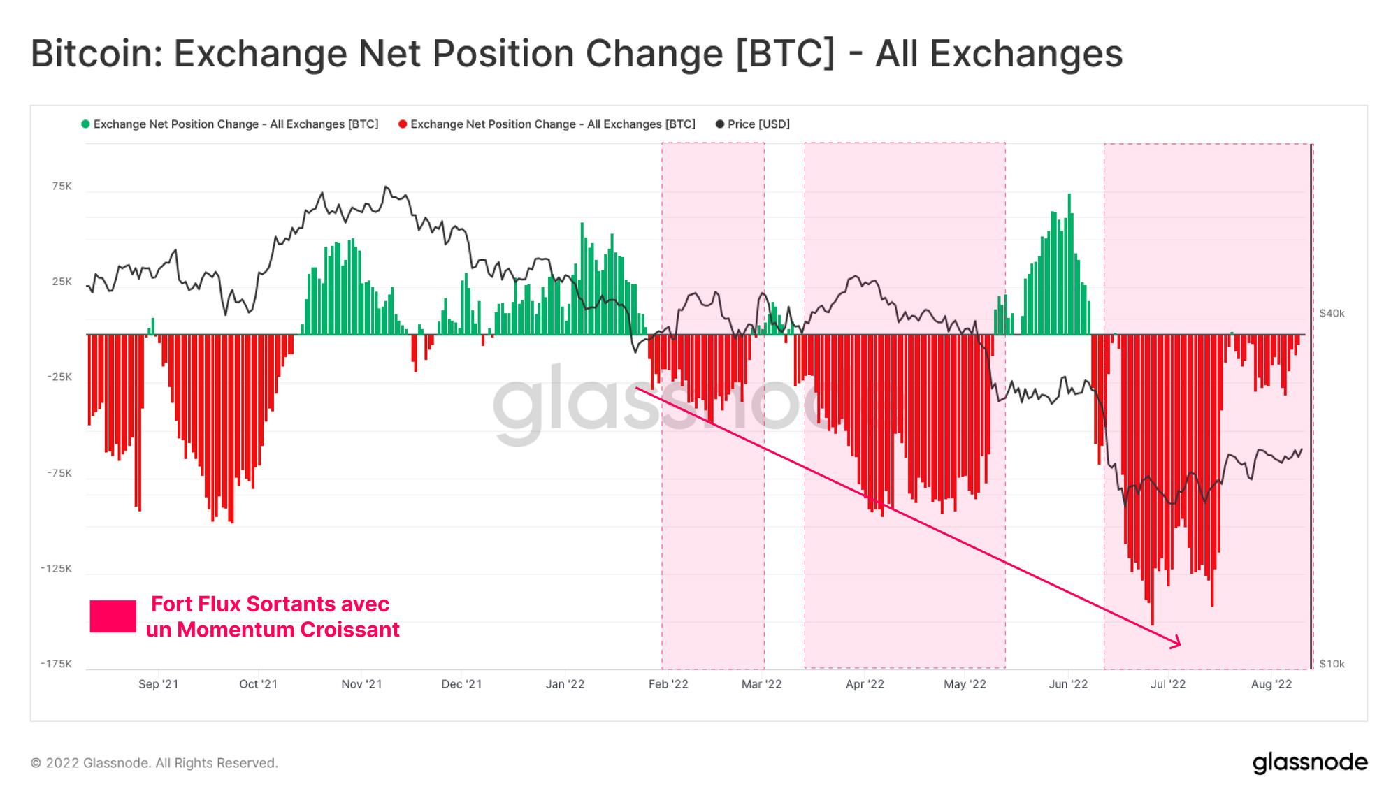 Dans l'ensemble, les exchanges ont connu une sortie nette de -100K BTC en mai 2022, ce qui représente 3,2% du total des sorties depuis l'ATH de mars 2020.