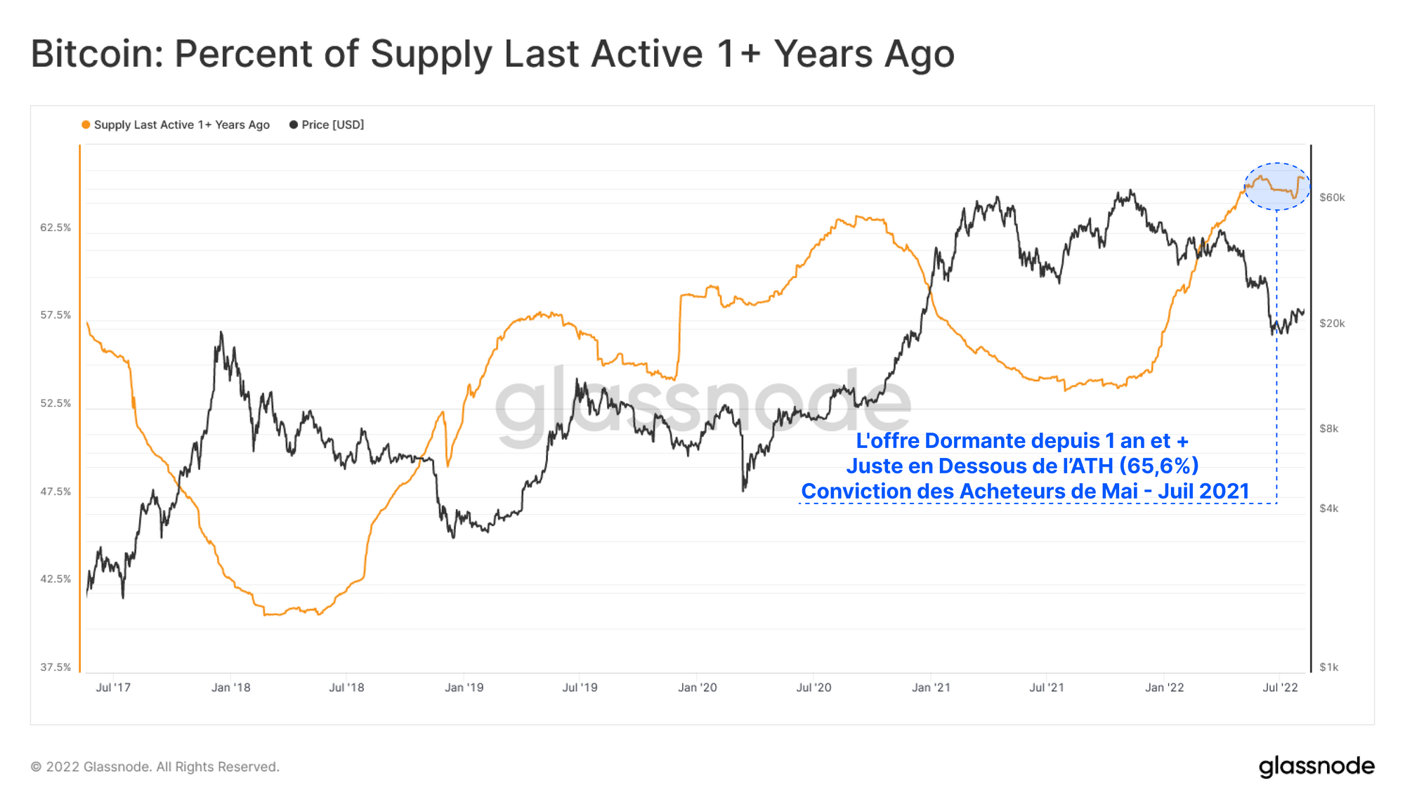 La quantité d'offre restée dormante pendant au moins 1 an donne un aperçu de la nature circulaire du bitcoin à travers les cycles de distribution et d'accumulation.