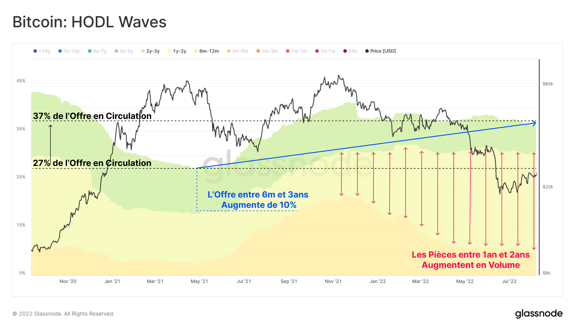 La bande 6m-12m peut être vue comme s'étendant après la grande migration des mineurs, car les HODLers ont refusé de vendre au plus bas. Cette vague coïncide avec un creux dans l'offre active il y a plus d'un an. Dans un régime dominé par les HODLers, l'offre a pu arriver à maturité, ce qui a conduit à un expansion de la bande des 1 an-2 ans après l'ATH de novembre 2021.
