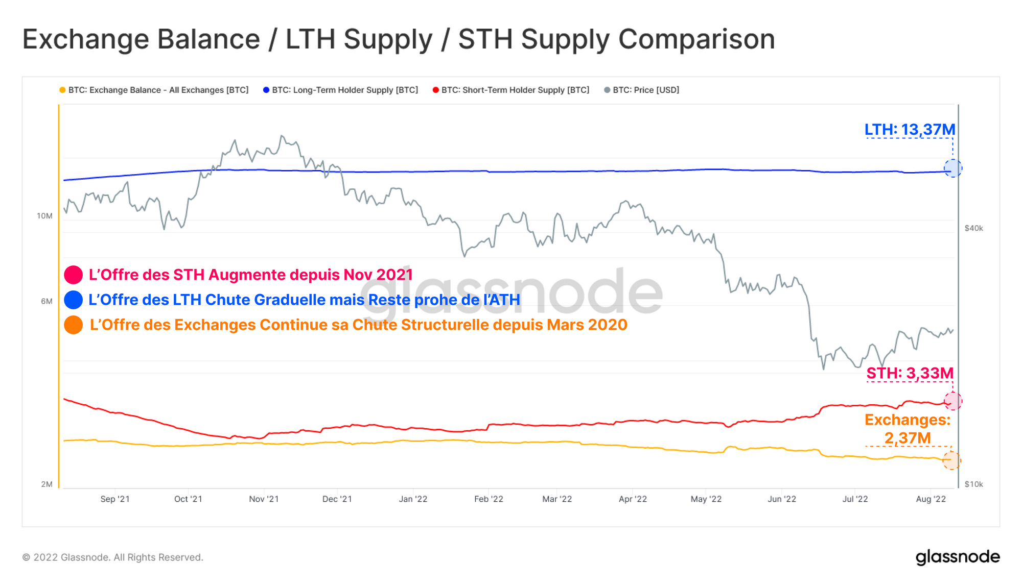 Lorsque l'on considère l'offre en circulation du bitcoin, on peut l'inspecter à partir de trois composantes : l'offre à long terme, à court terme et l'offre détenue par les échanges.