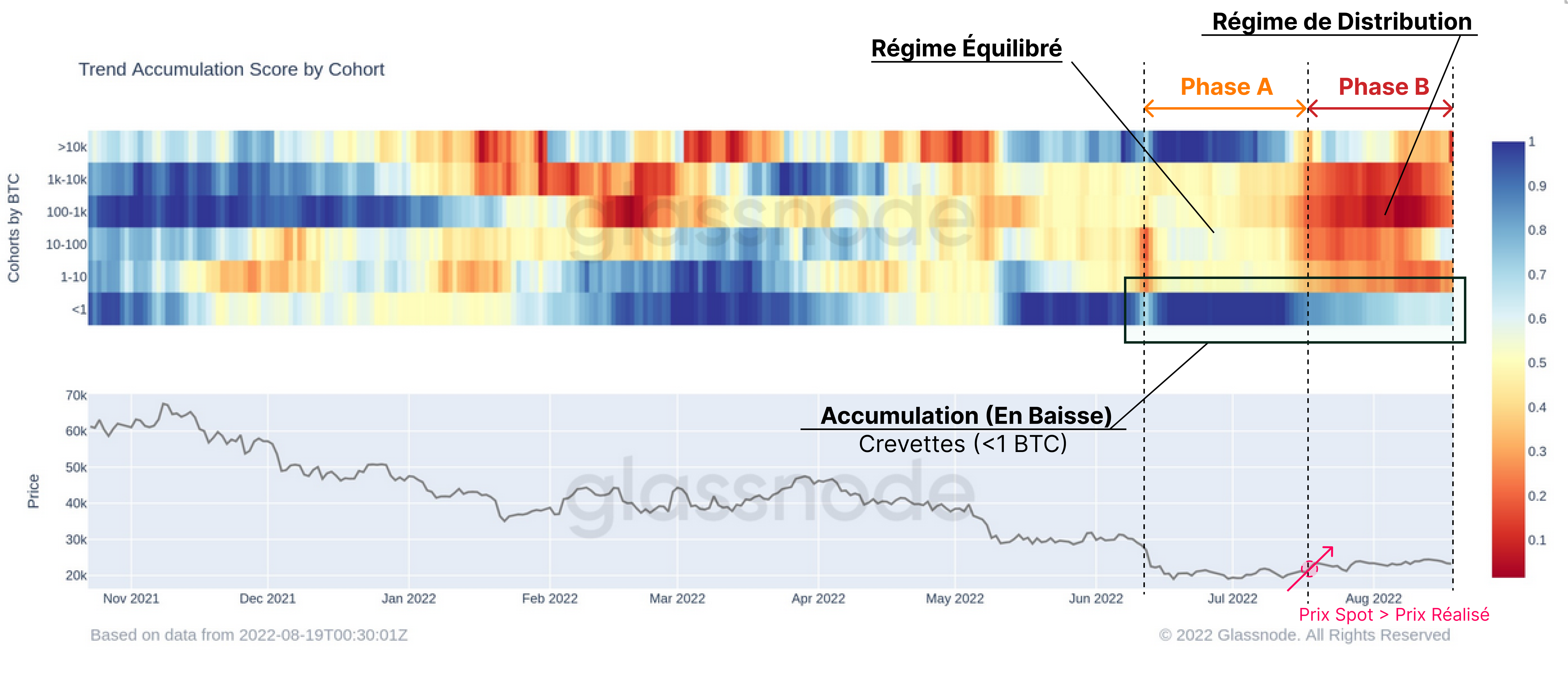 - Phase B 🔴 : Après la reconquête initiale du prix réalisé, toutes les cohortes ont saisi l'opportunité de distribuer leurs pièces. Il est intéressant de noter que la forte dynamique d'accumulation persistante des crevettes (<1 BTC) s'est également affaiblie dans cette phase.