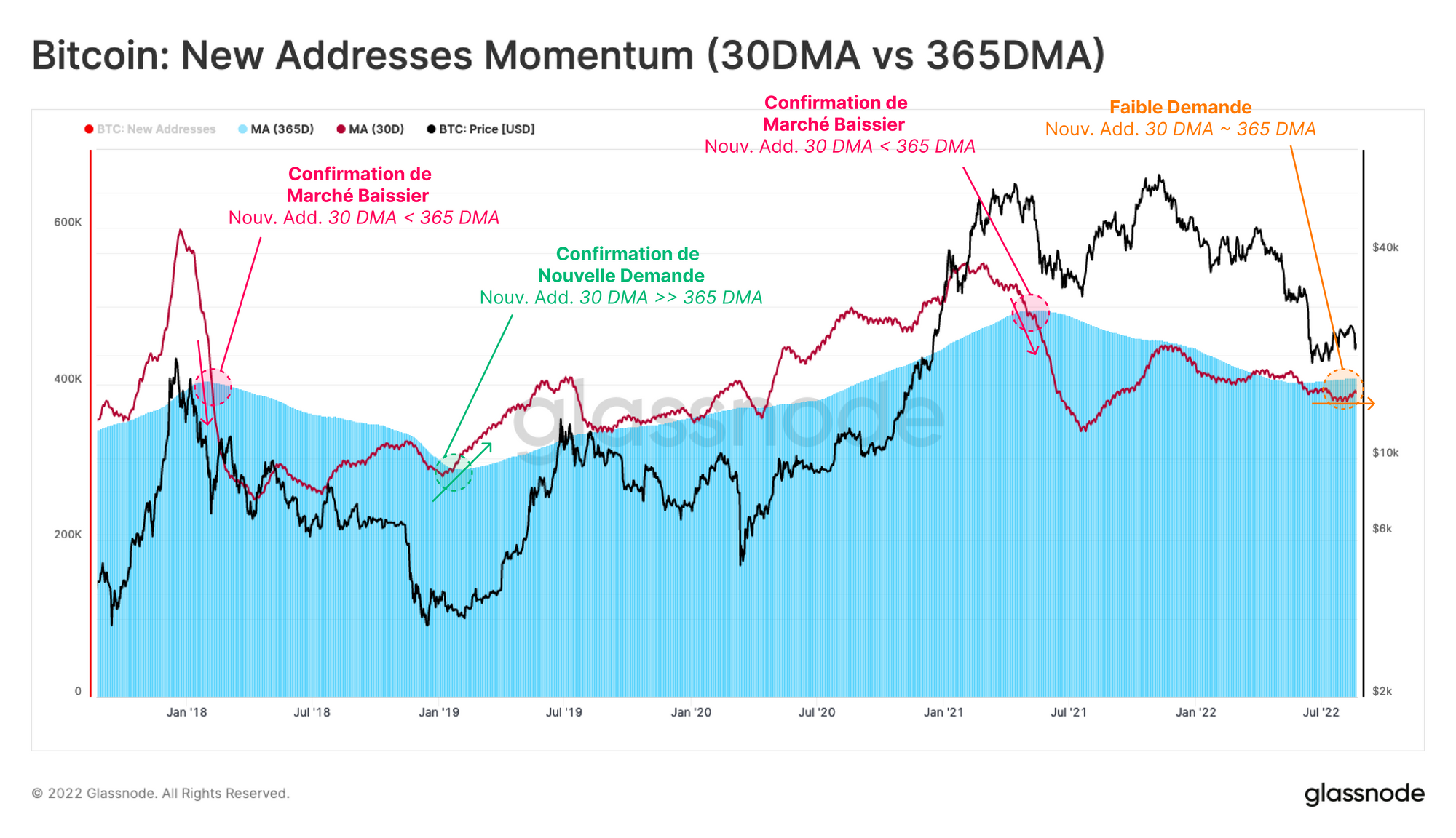 - Confirmation du marché baissier 🔴 : Parallèlement à la chute des prix à partir de l'ATH d'avril 2021, la DMA 30 des nouvelles adresses a fortement chuté en dessous de la DMA 365. Cela a établi la confirmation que la phase de marché baissier était probablement en vigueur à travers la lentille de l'activité du réseau.