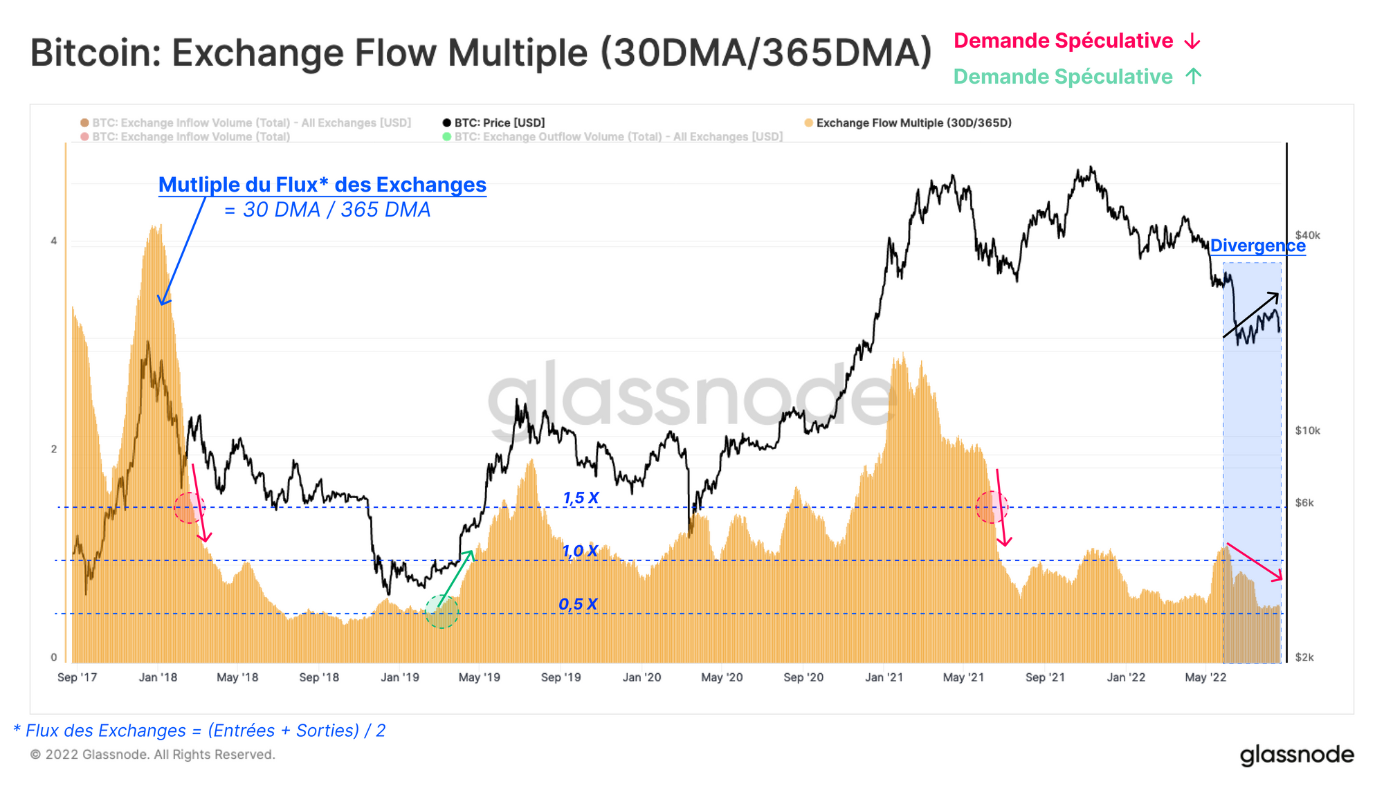 Pour établir un indicateur explicite basé sur cette connexion entre les flux d'échange et le sentiment du marché au sens large, nous avons défini une nouvelle métrique, le Multiple du Flux des Exchanges. Cette métrique est égale au rapport entre la moyenne mensuelle des flux d'échange et sa valeur moyenne annuelle.