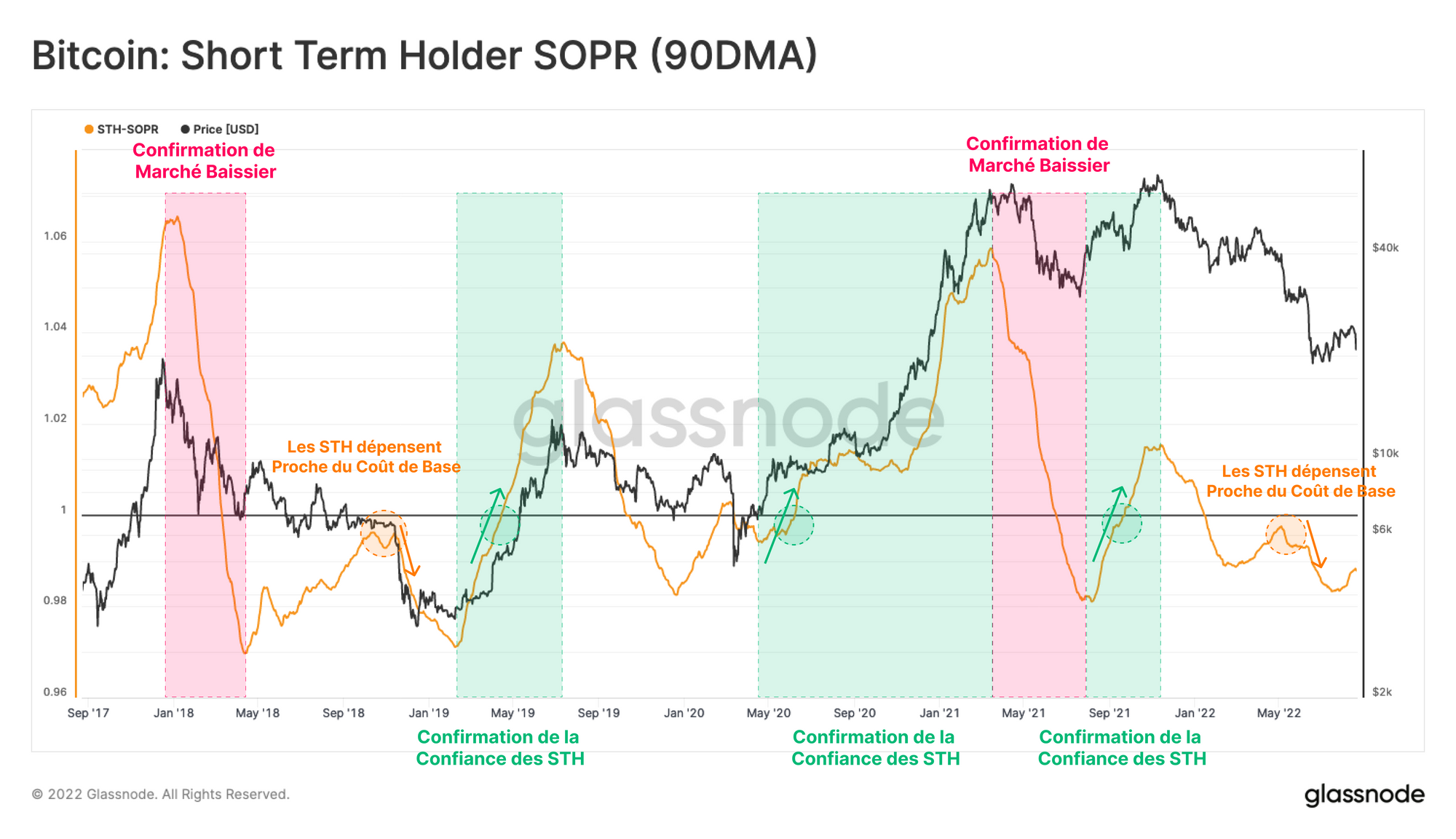 🔔 Idée d'alerte : La rupture de STH-SOPR (90 SMA) au-dessus de 1,0 signalerait une hausse de la rentabilité à la chaîne, suggérant une force potentielle du marché et une reprise de la demande.