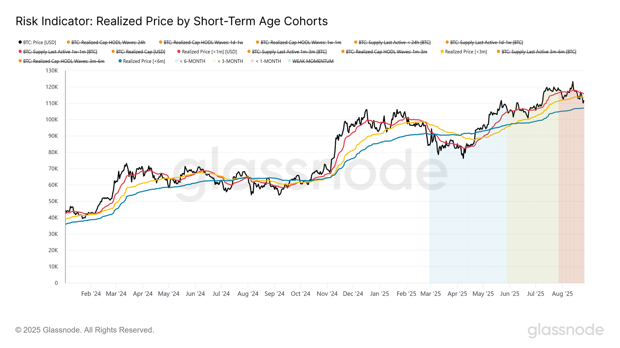 Pour mieux évaluer la tension du marché, nous nous tournons vers le coût de base des investisseurs à court terme. Cette métrique reflète le prix d'achat moyen des BTC détenus par les investisseurs qui sont entrées sur le marché au cours des 1 à 6 derniers mois, et sert de repère psychologique.