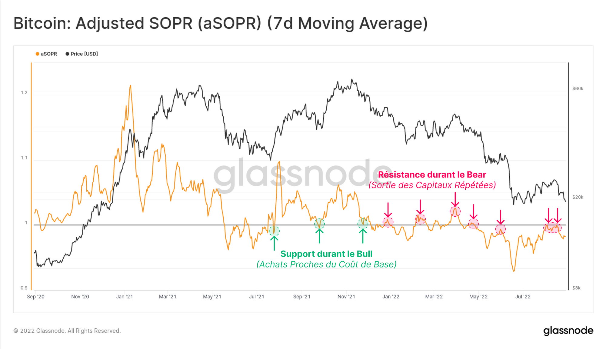 🔔 Idée d'alerte : une cassure de l'aSOPR (7DMA) au-dessus de 1,0 signalerait que les dépenses globales sont de nouveau profitables, suggérant une force potentielle du marché et une reprise de la demande.