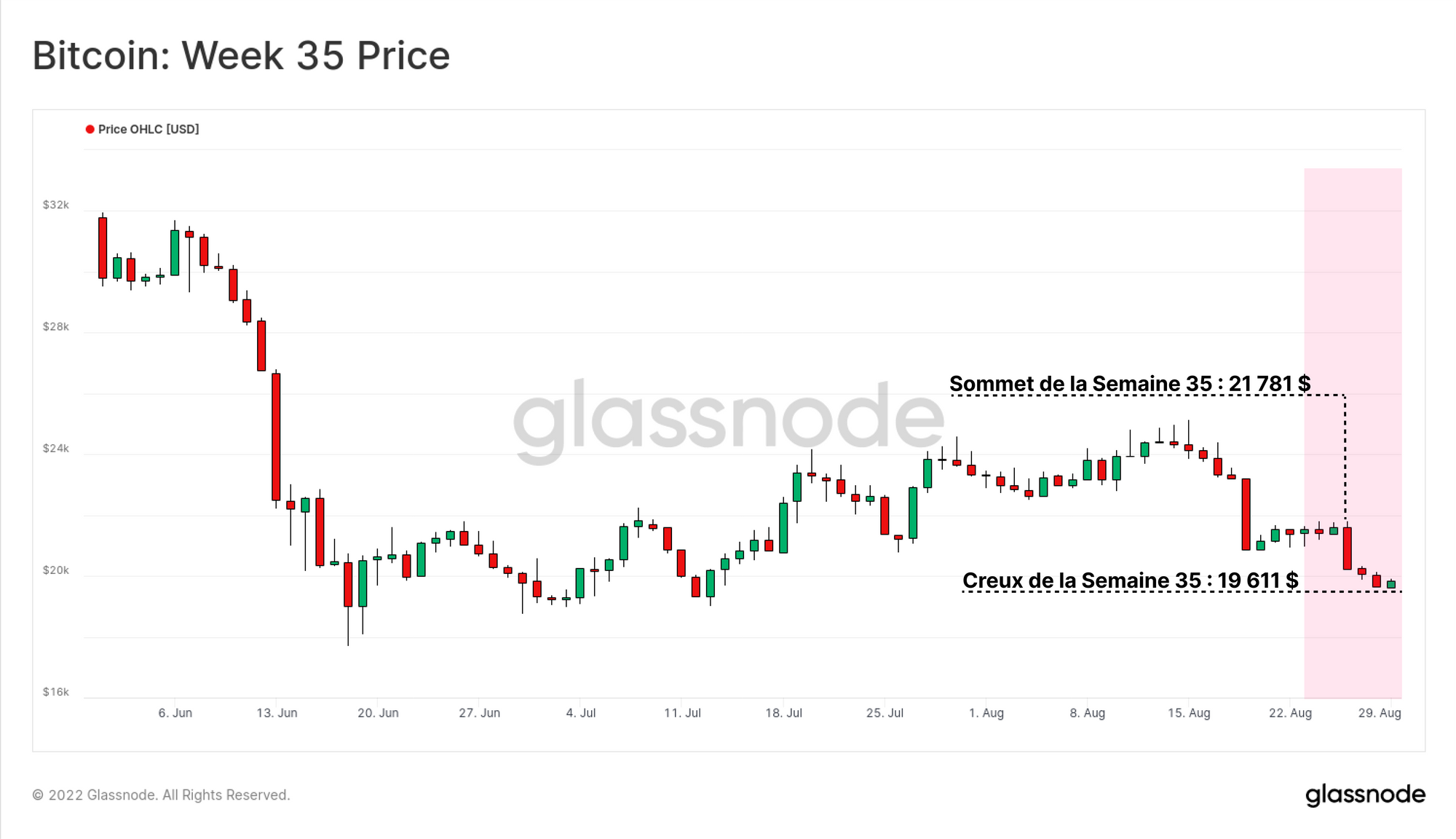Les gouverneurs de la Réserve fédérale américaine continuant à signaler une position questionnable sur l'inflation, le bitcoin, en tant qu'indice de la liquidité mondiale en devenir, a réagi en conséquence. Les prix se sont échangés à la baisse cette semaine, sortant d'un sommet de 21 781 $ pour atteindre un plus bas de 19 611 $.