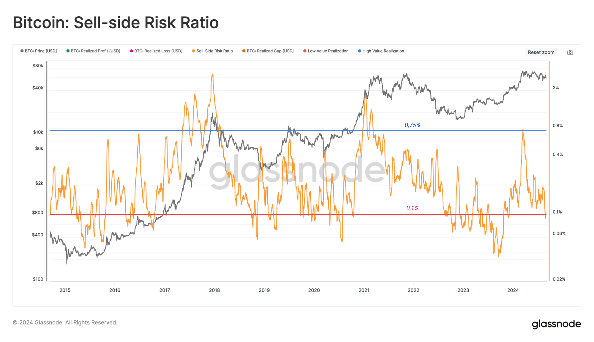 Le Sell Side Risk Ratio a chuté vers la bande inférieure, ce qui suggère que la plupart des pièces transigées sur la chaîne le sont à un niveau proche de leur prix d'acquisition initial.