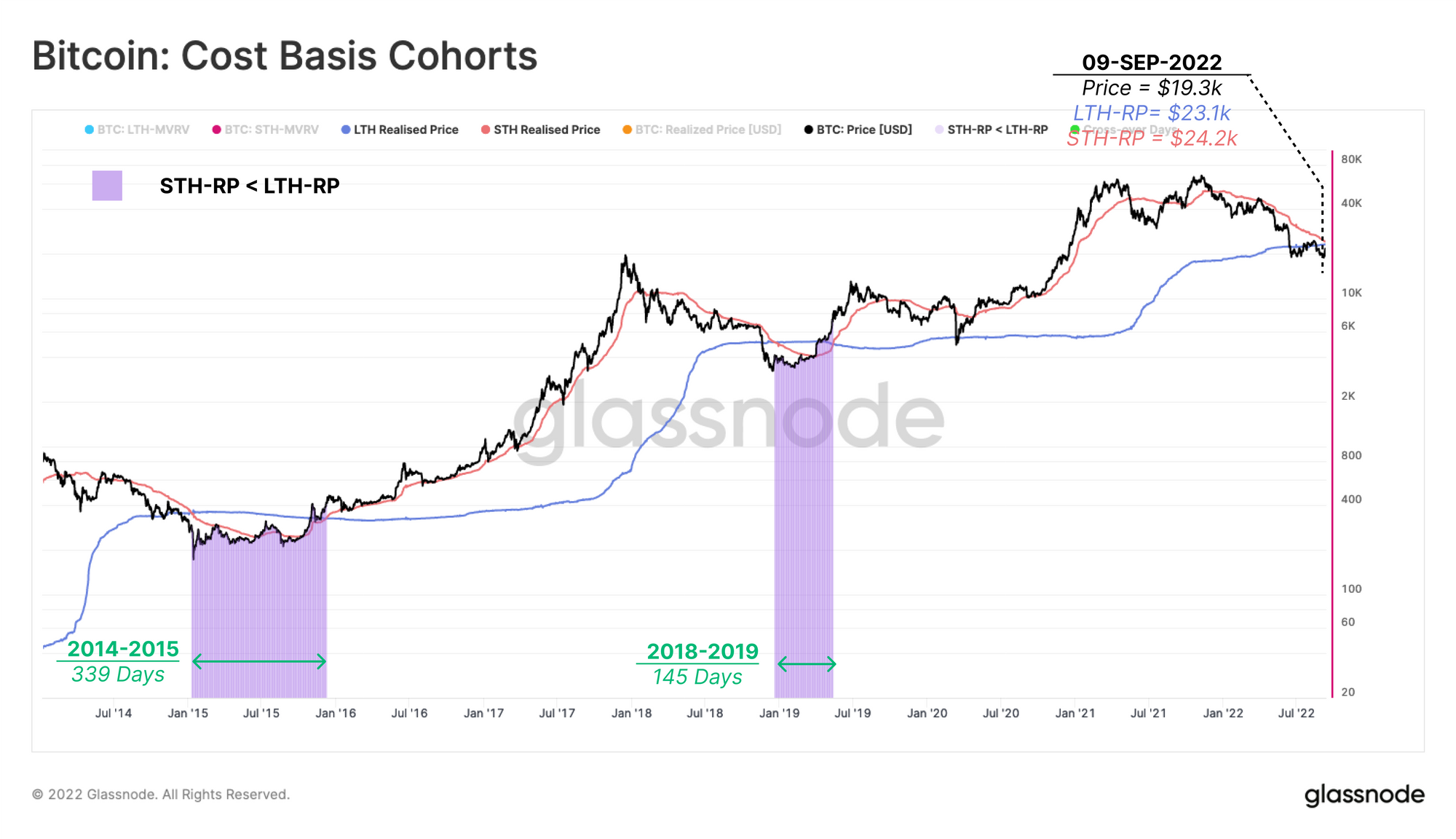 Malgré une tendance à la baisse de 10 mois, ce marché baissier n'a pas encore atteint ce stade de capitulation. Les marchés baissiers précédents ont mis entre 145 et 339 jours pour se rétablir après un tel croisement. Étant donné la trajectoire de ces deux traces de prix réalisés, nous pouvons nous attendre à un croisement d'ici la mi-septembre.