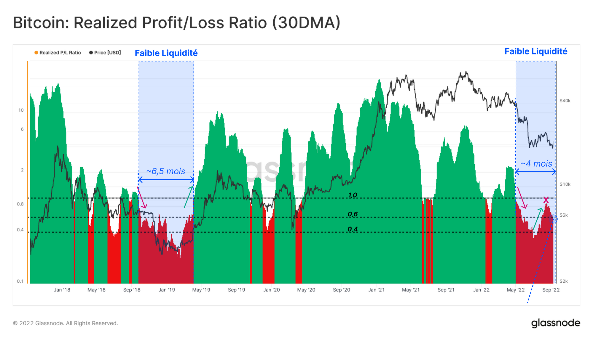 L'intervalle entre le passage sous le niveau 1.0 et le retour à ce niveau est le moment où le sentiment baissier est le plus fort, en raison de l'insuffisance de la demande de liquidités.