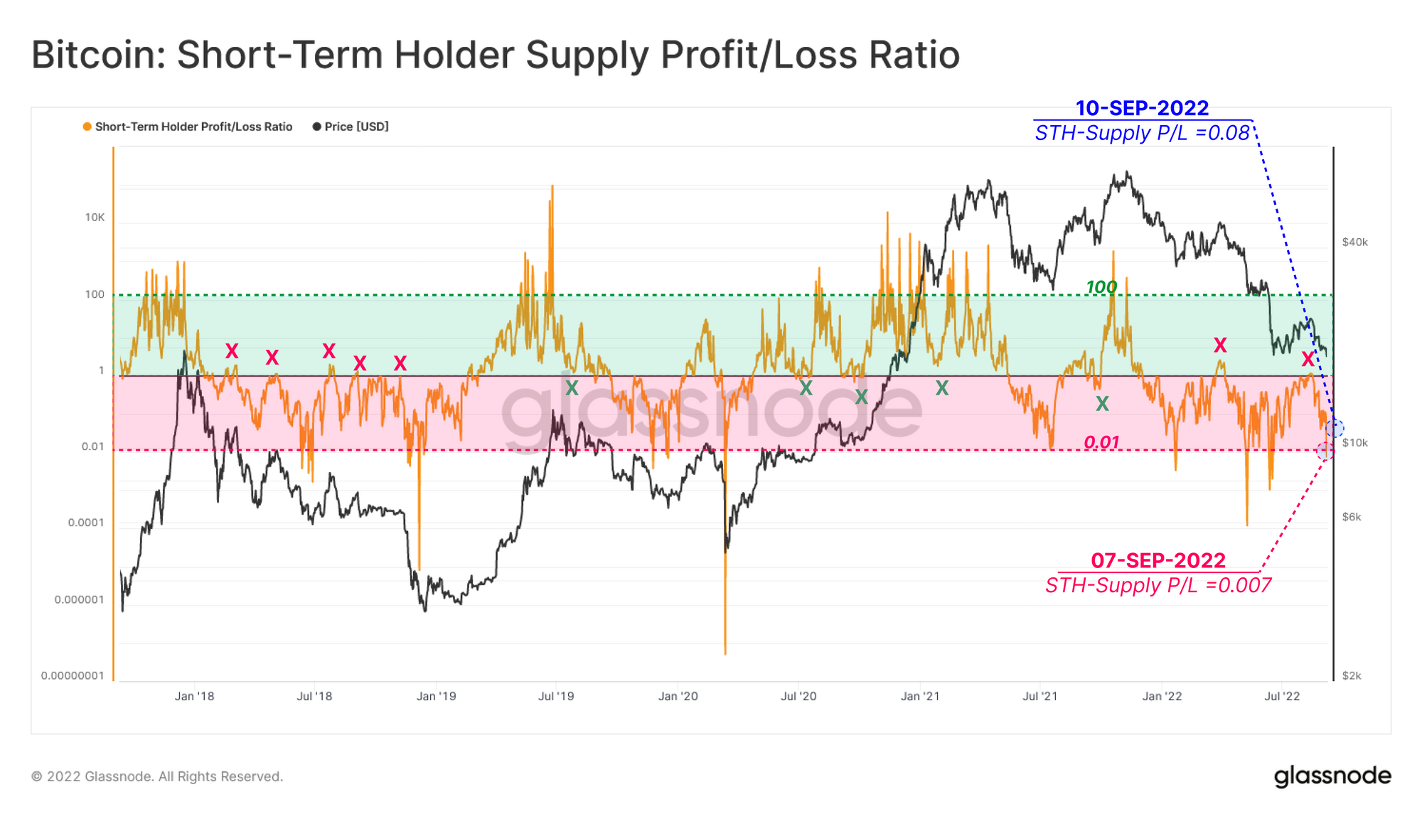 - Ratio Profit/Perte de l'Offre des STH < 1 🟥 : Tout au long des marchés baissiers, ce ratio se négocie en dessous de 1 puisque l'offre de détenteurs à court terme est principalement en perte. Des valeurs inférieures indiquent une plus grande probabilité de capitulation et lorsque la capitulation a eu lieu, précédant une forte reprise à la hausse.