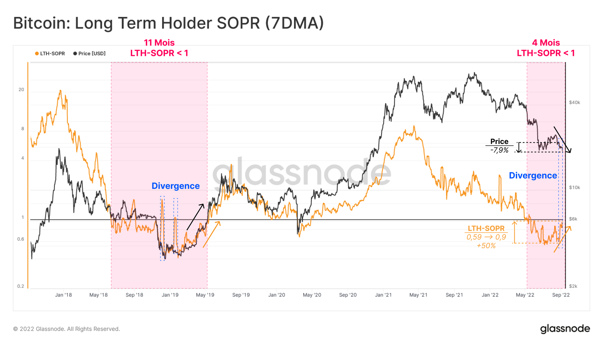 Les marchés baissiers du bitcoin ont la capacité de secouer même les investisseurs les plus inébranlables. Ce régime de faible rentabilité des LTH peut être observé via le LTH-SOPR. Historiquement, une forte rupture au-dessus de 1 a signalé le retour à une dynamique haussière sur le marché.