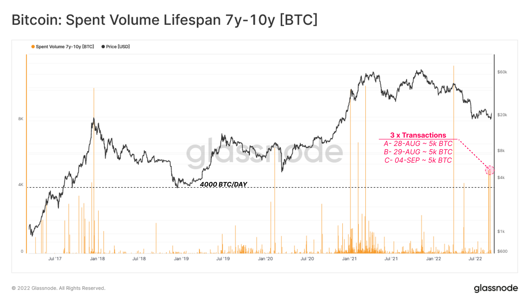 - A- Bloc # 751518, 28-Août-2022 (19,6k $), Dépense 5,000 BTC (1,500 BTC à un destinataire inconnu et 3,500 BTC à Kraken), Date d'achat originale : 19-Dec-2013 ($543.14)