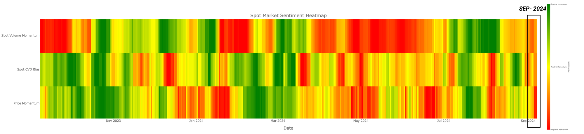En combinant les transformations MinMax pour le volume, le CVD et le prix respectivement, nous sommes en mesure de produire une carte thermique du sentiment concernant les valeurs des caractéristiques entre 1 et -1. Nous pouvons considérer ceci dans le cadre suivant :