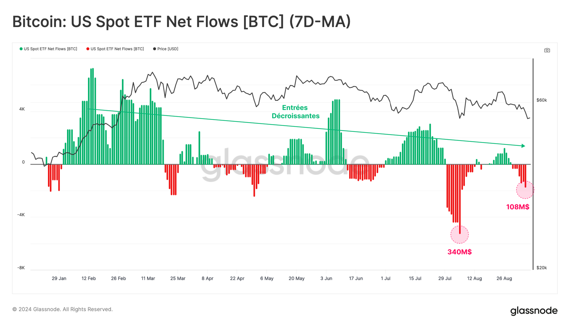 En commençant par les ETF Bitcoin, nous pouvons voir que les flux nets de capitaux en USD ont diminué depuis août 2024 et rapportent maintenant une sortie de 107 millions de dollars par semaine.
