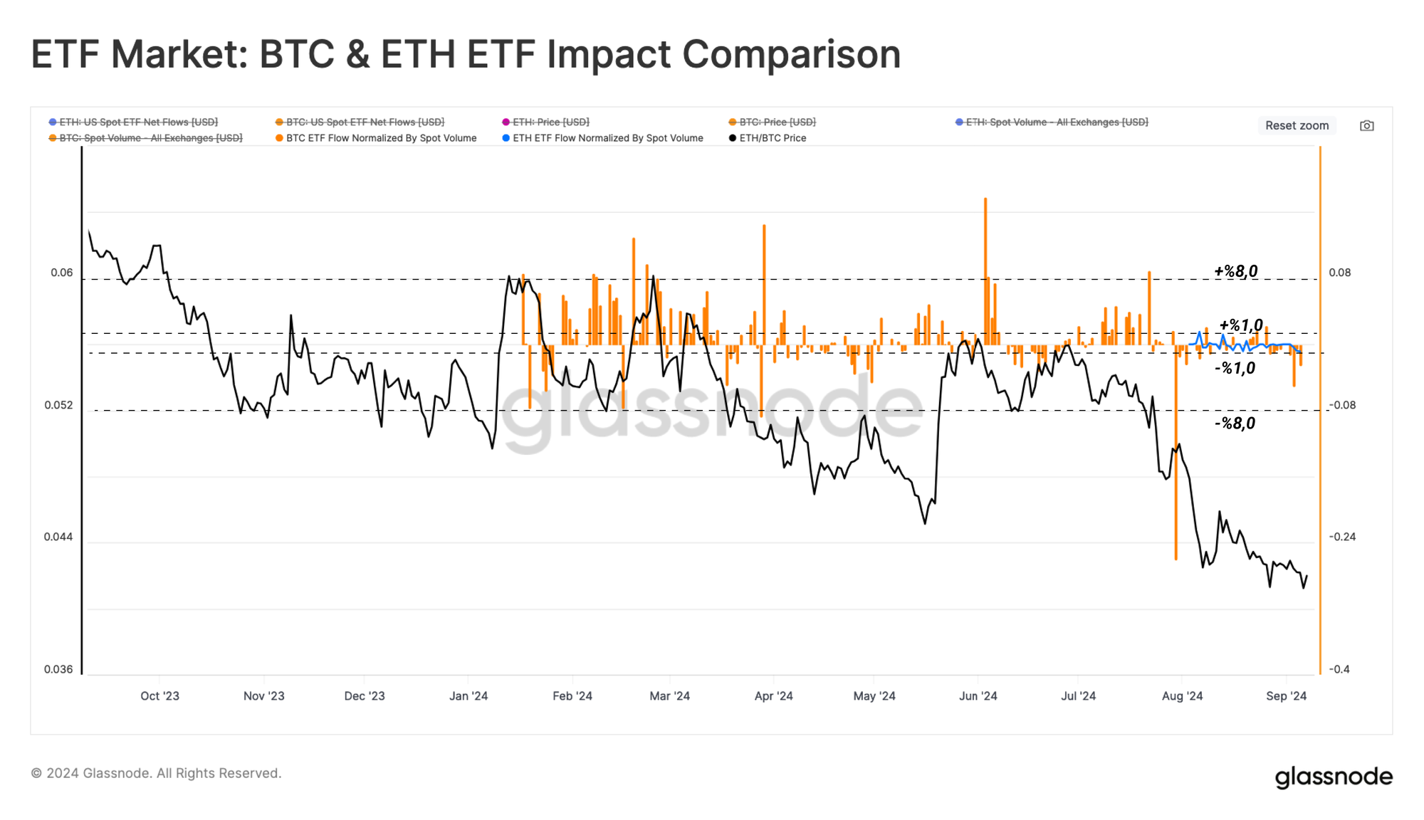 Comme le montre le graphique ci-dessous, l'influence relative des ETF sur le marché de l'Ethereum équivaut à une fourchette de ±1 % du volume au comptant, contre ±8 % pour l'ETF Bitcoin.