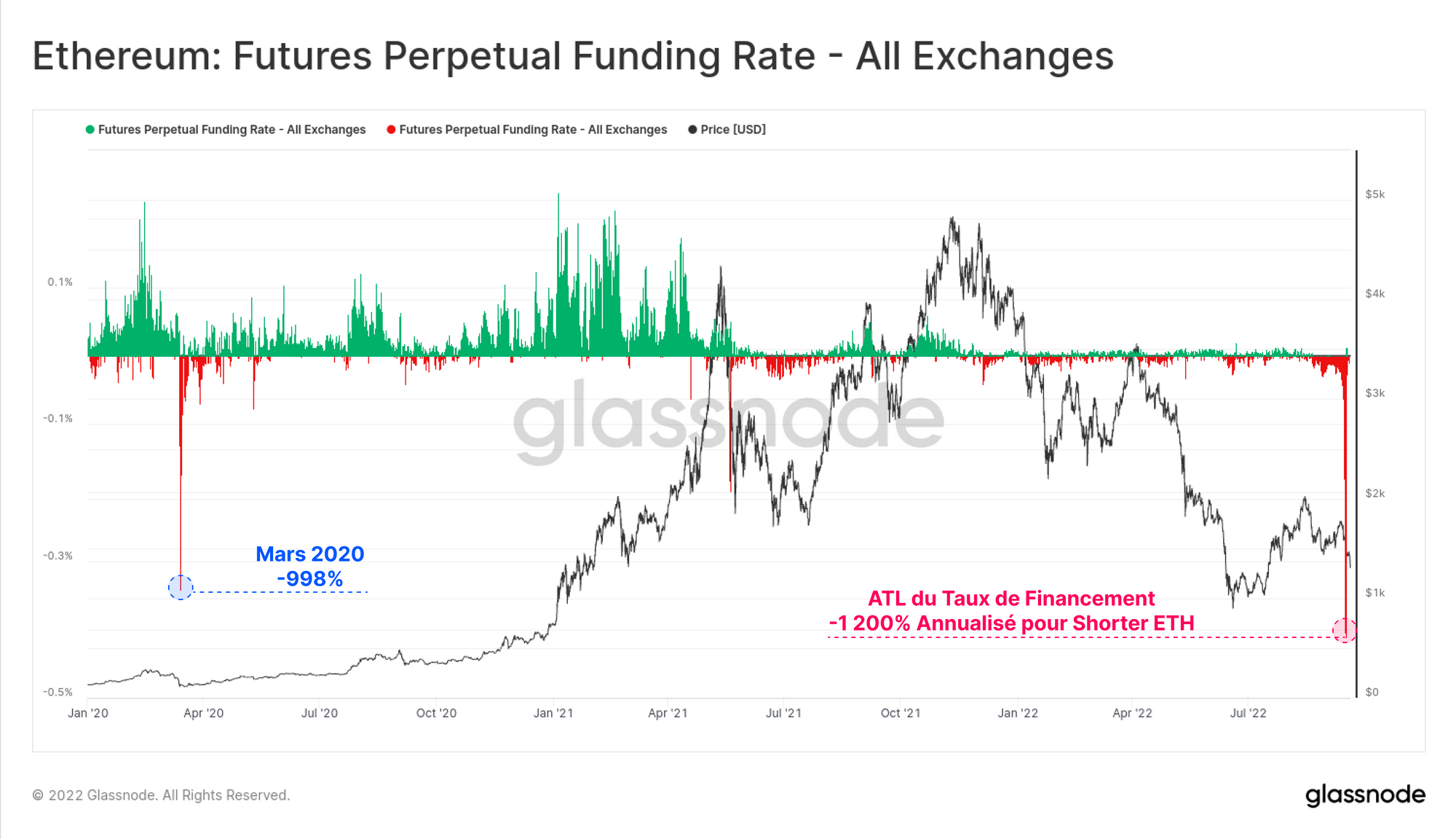 Jusqu'au Merge, les traders des marchés à terme perpétuels payaient un taux de financement annualisé de -1 200 % pour maintenir leurs positions short sur ETH. Il s'agit du taux de financement négatif le plus bas de tous les temps, éclipsant le précédent pic de -998% atteint lors de la liquidation de mars 2020.
