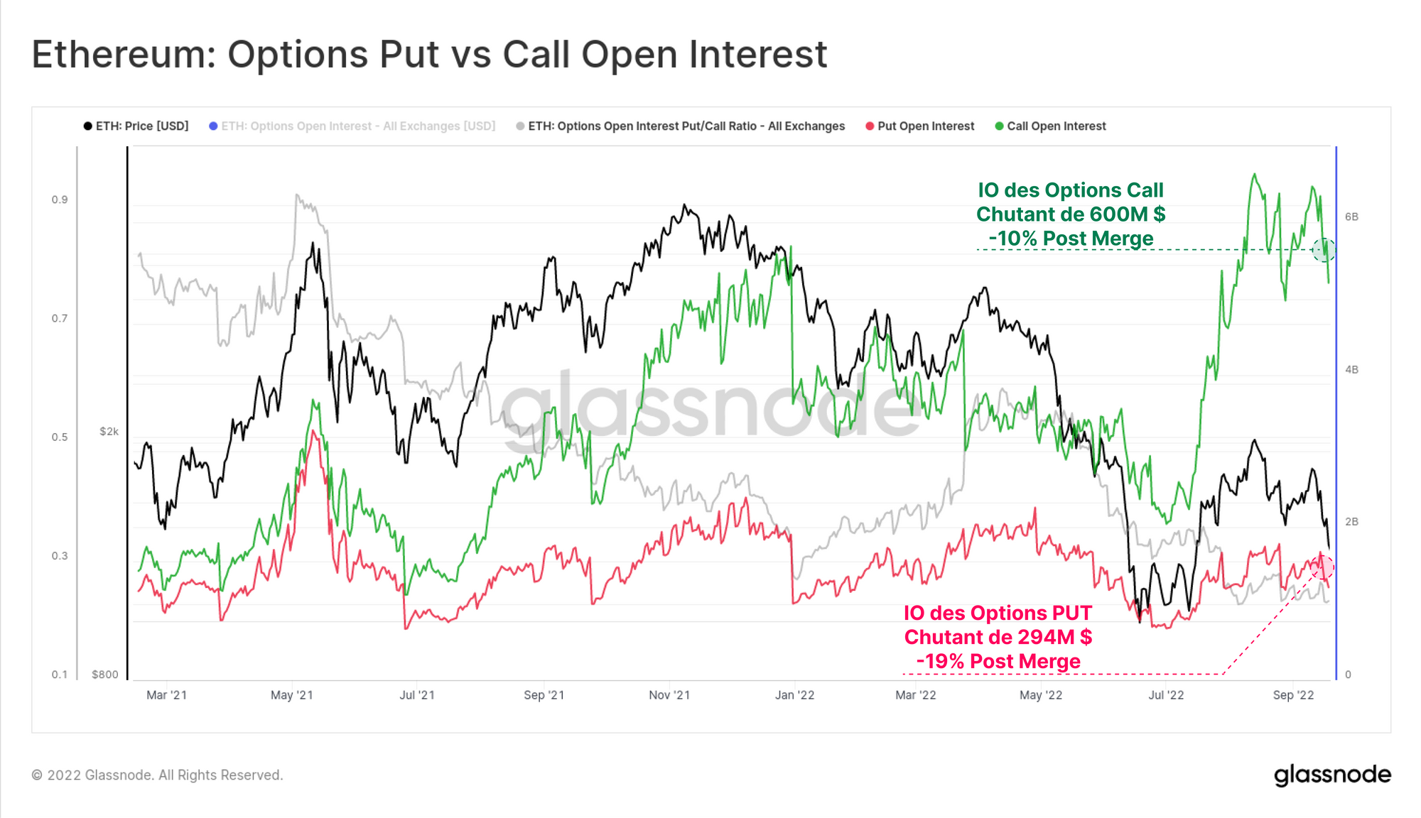 Sur les marchés des options, où une grande partie de la spéculation récente sur les ETH a eu lieu, l'intérêt ouvert des options d'achat a diminué de 600 millions de dollars après le Merge (soit une baisse de 10 %). Il reste un total de 5,2 milliards de dollars en valeur d'option d'achat en cours, ce qui est encore beaucoup plus élevé que les normes de 2021.