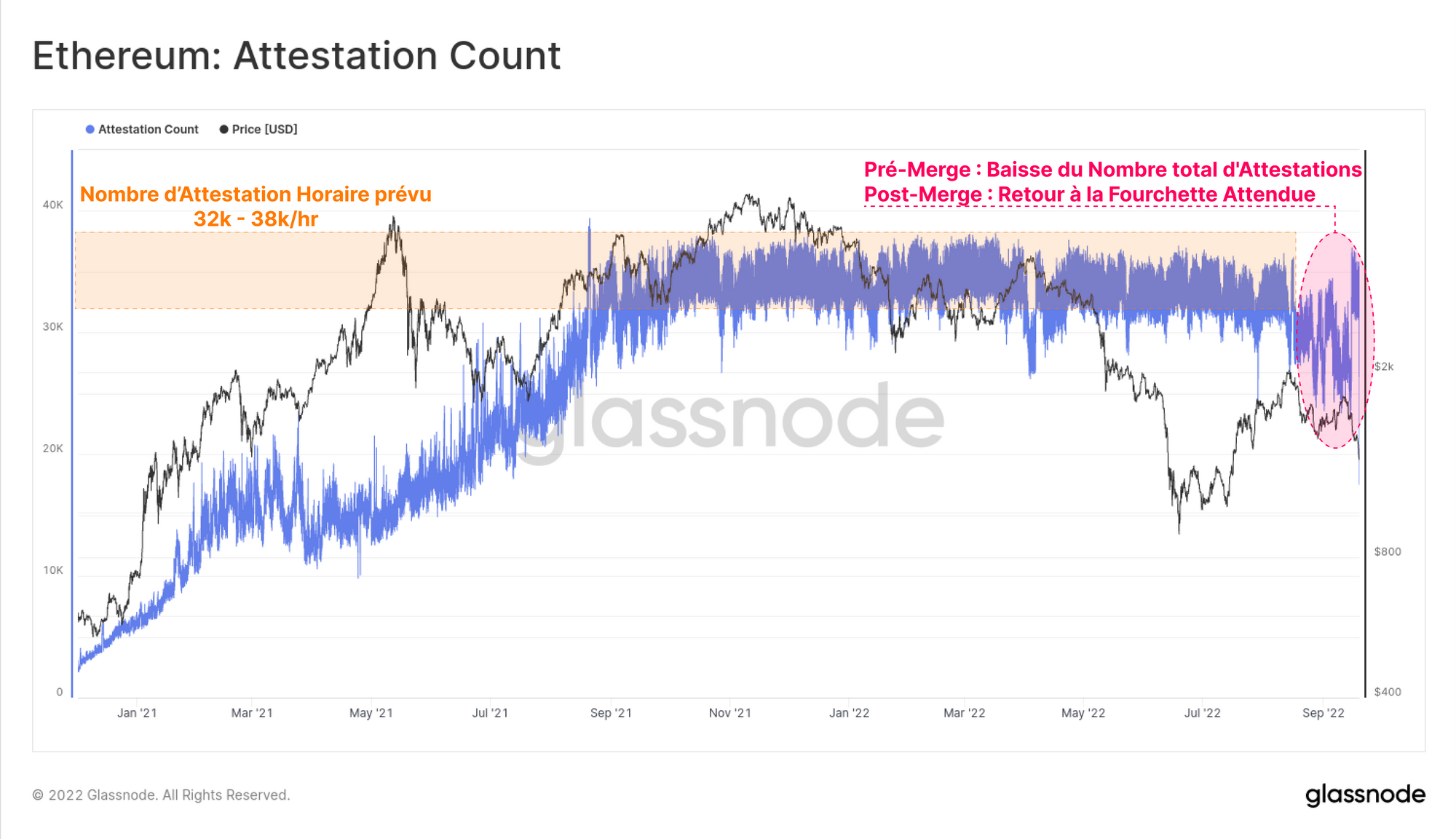 Le nombre de votes d'attestation en bout de chaîne a également connu une brève baisse, mais a également réintégré dans la fourchette attendue de 32k à 38k attestations/heure.